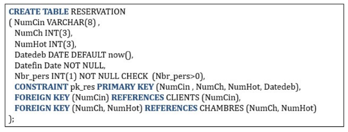 • Client (Code_cl, nom_cl, Pren_cl, adr_cl, tel_cl, dn, age)