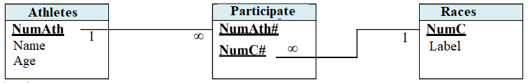 In this case, the "participate" relationship is transformed into a table identified by two columns, which are the primary keys of the "athlete" and "race" tables (the two keys will be both primary and foreign keys in the new table).