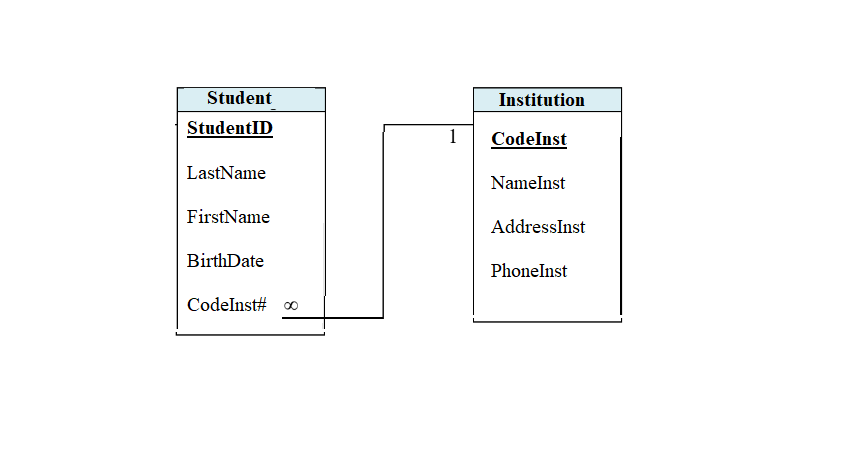 Student (StudentID, LastName, FirstName, BirthDate, CodeInst#)