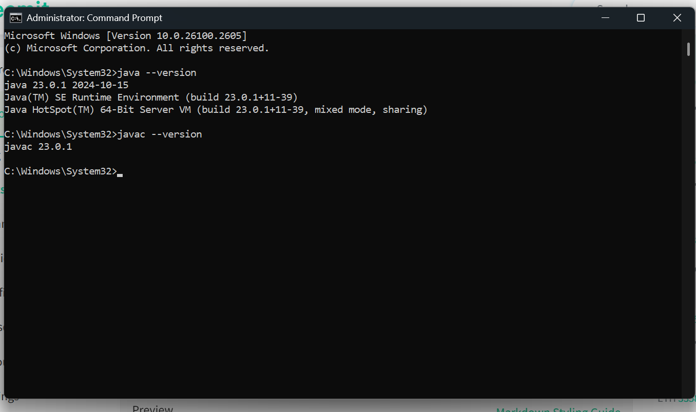 To verify the installation I opened my command prompt and run the command of java--version and then javac--version to check out the variance installed in my PC.