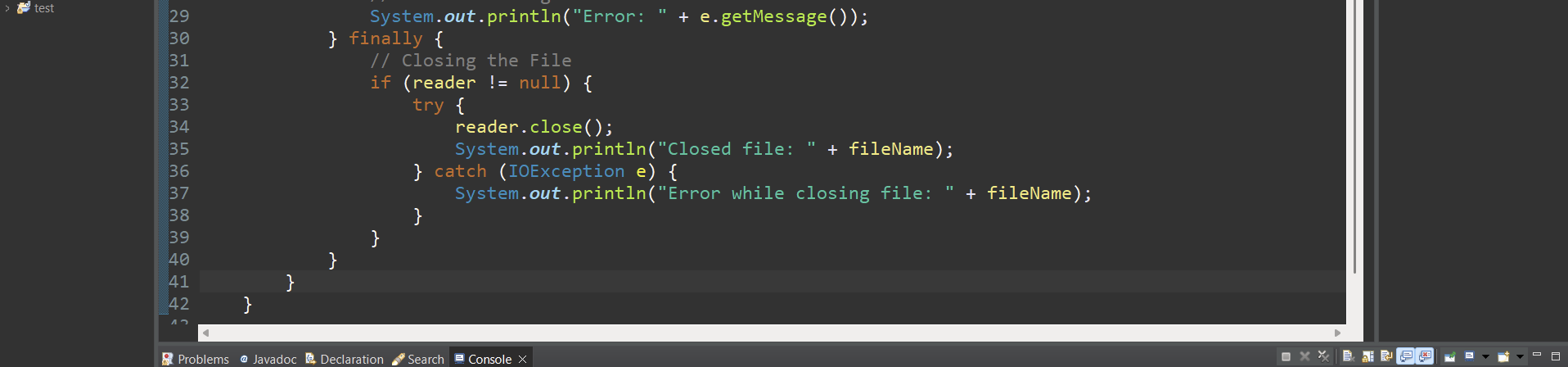Next is the catch block for printing the messages IOException thrown.. The Finally block makes sure the file is closed, no matter if an exception was thrown during reading. First of all, check if the BufferedReader object is not null before closing and print the message for confirmation.
