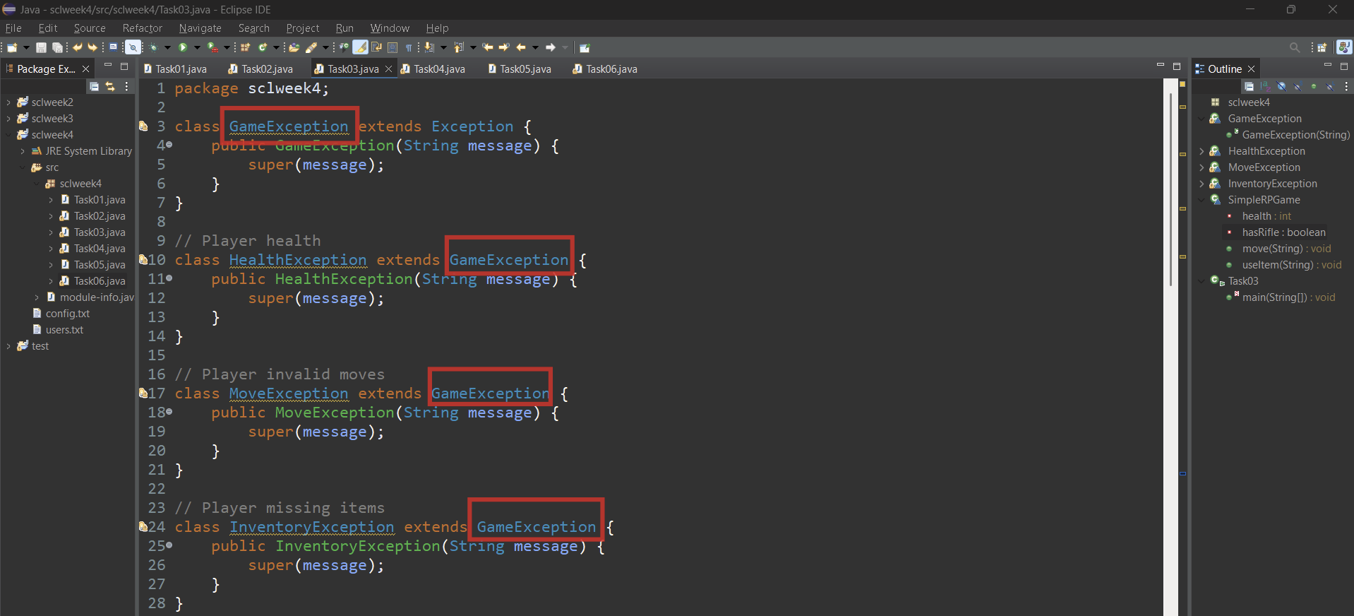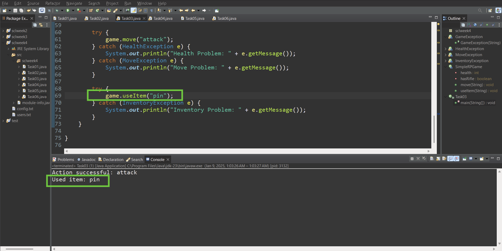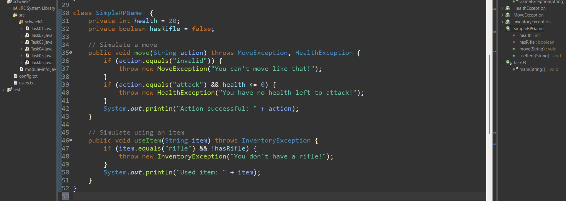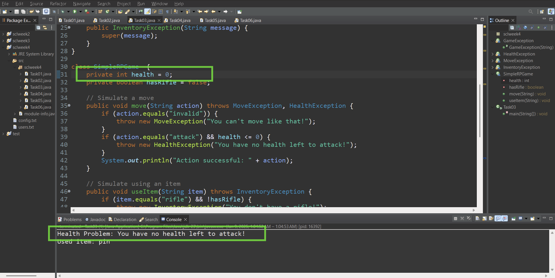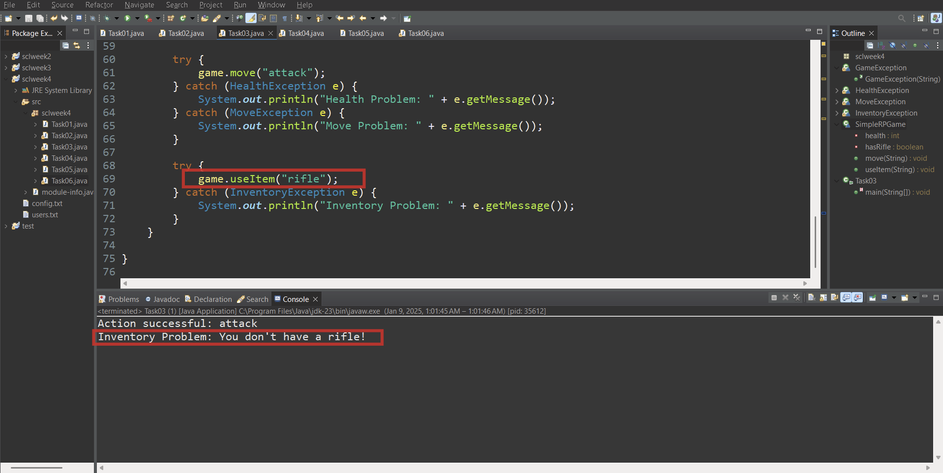 Here we have two methods, one to handle player movement and the other to handle the item used. The move(String action) method will check if movement is in the wrong direction to throw the MoveException and if health points are insufficient (i.e. less than or equal to zero) to throw the InventoryException. At this point, if all checks are valid. A success message is printed and moved to the next method useItem(String item) for the player to use an item. If the player doesn't have the item, throw an InventoryException. In my case I will use a Rifle(gun), and if there is no error. A success message is printed.