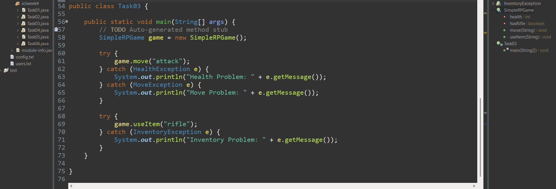 Here is our main Class, and we start by creating SimpleRPGame objects. We are using try-catch blocks to run our program and handle moves by calling game.move("attack"). We have over 20 hearts so no exception is thrown. If in the case of HealthException, a message is printed or MoveException, a message is printed.