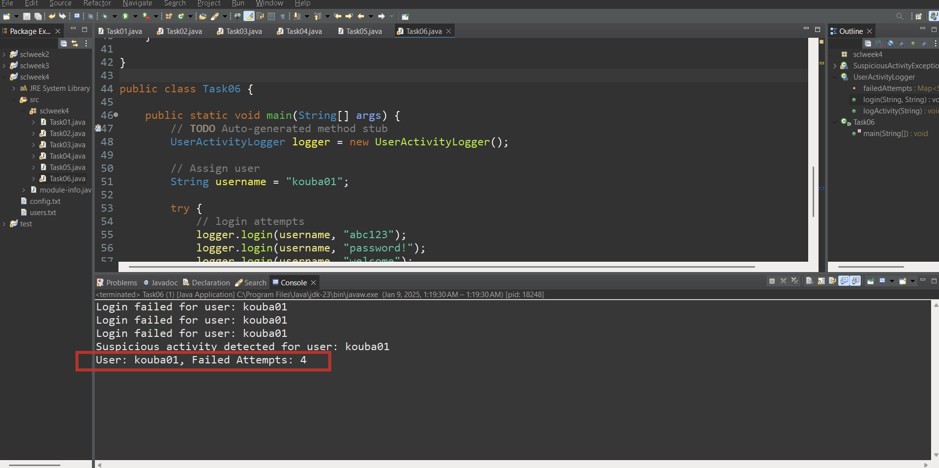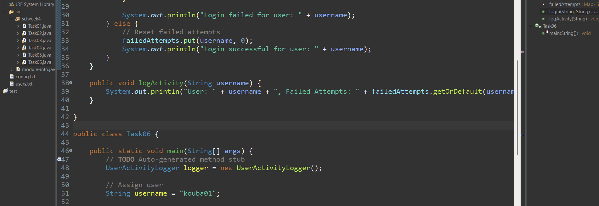 During every attempt, the logActivity() method logs the username and the number of failed attempts, which will be displayed to the administrator for review.