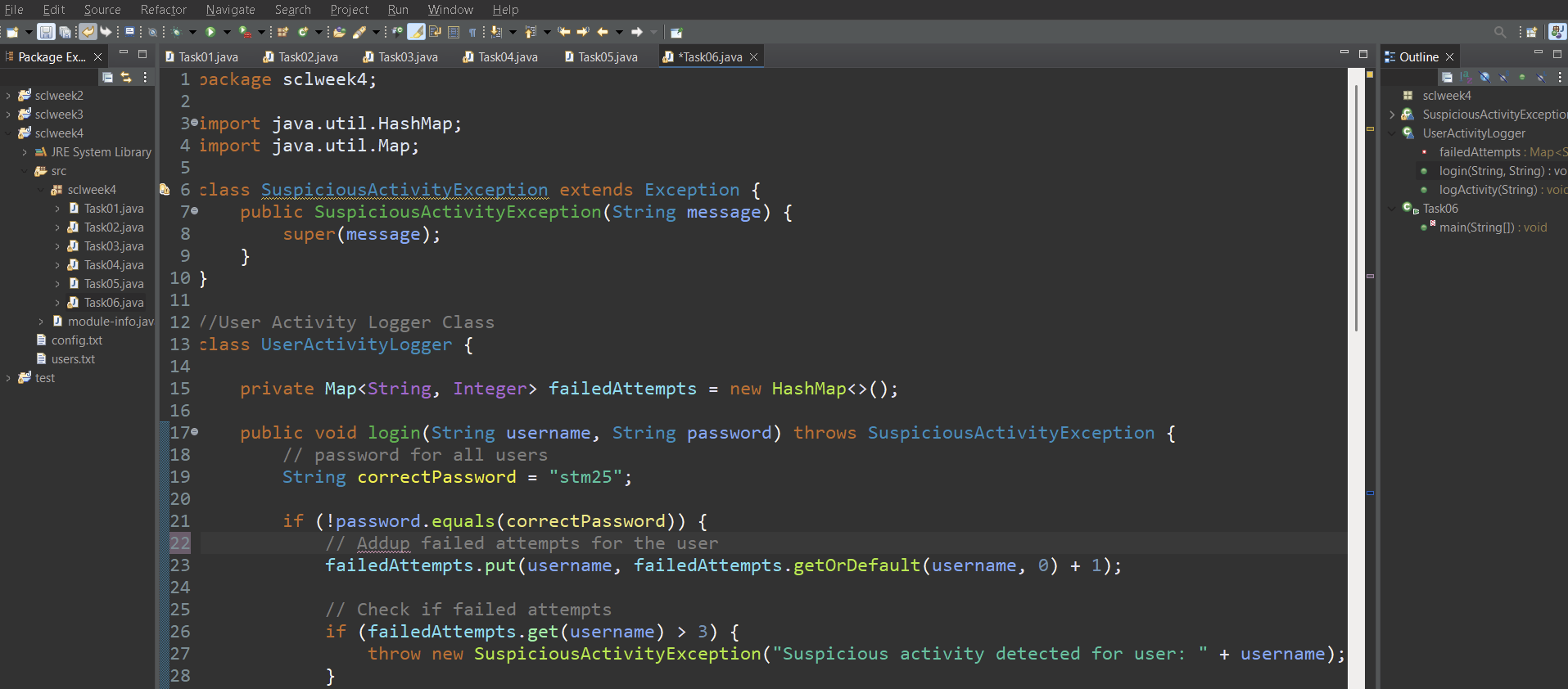 I started my program by creating the custom exception SuspiciousActivityException to handle suspicious login attempts. This will only happen when the cases exceed 3, which is the program threshold.
