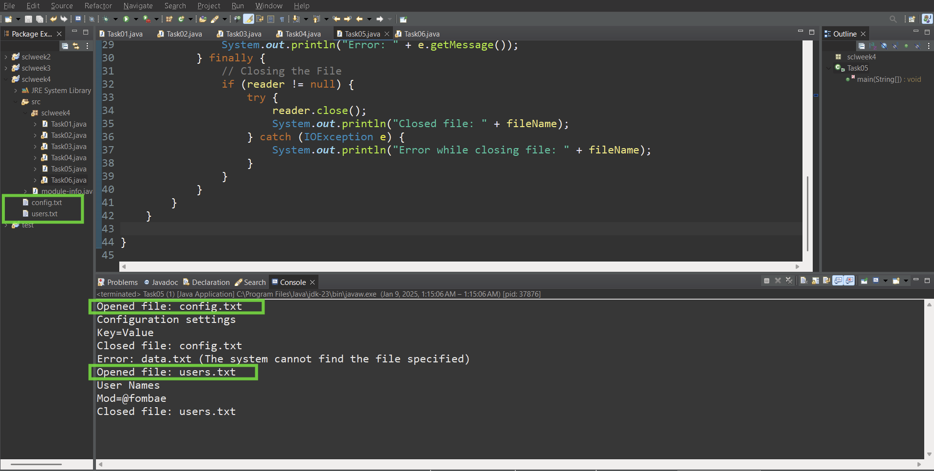Here we are looking at creating a program that will open multiple files, read their content, and close them. I will make use of the try block while including the Finally block for Resource Cleanup. We have to make use of BufferedReader, and FileReader, and handle file-related exceptions.