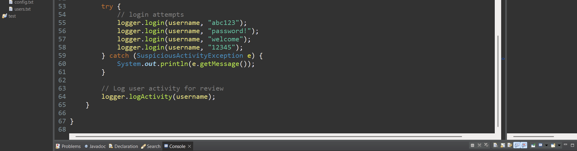 As the user continues to insert an incorrect password, the if statement checks the failed count and adds by one until it gets to the threshold. The SuspiciousActivityException exception is thrown and goes ahead to print the message "Login failed for user: ". If a password is correct, the failed attend count is reset to 0.