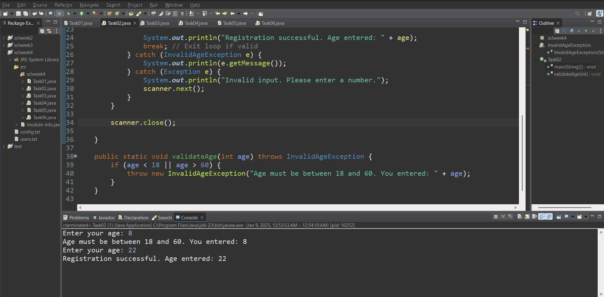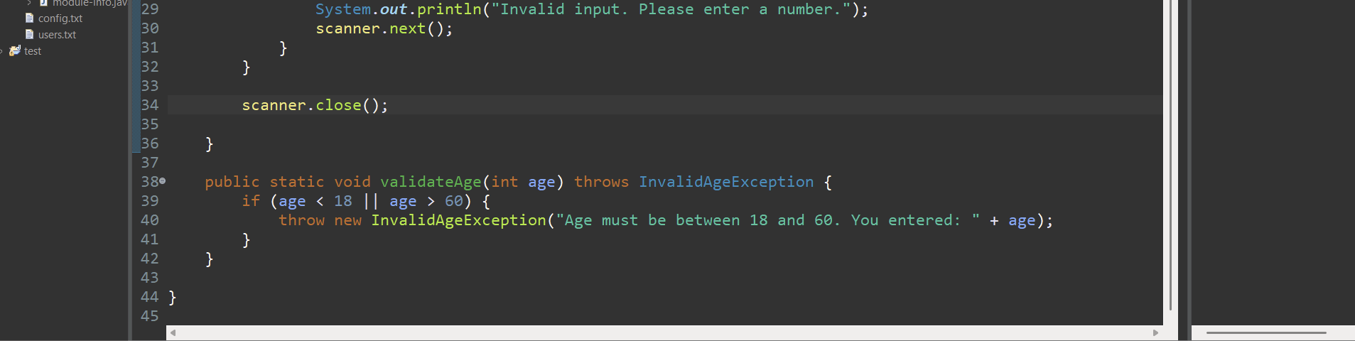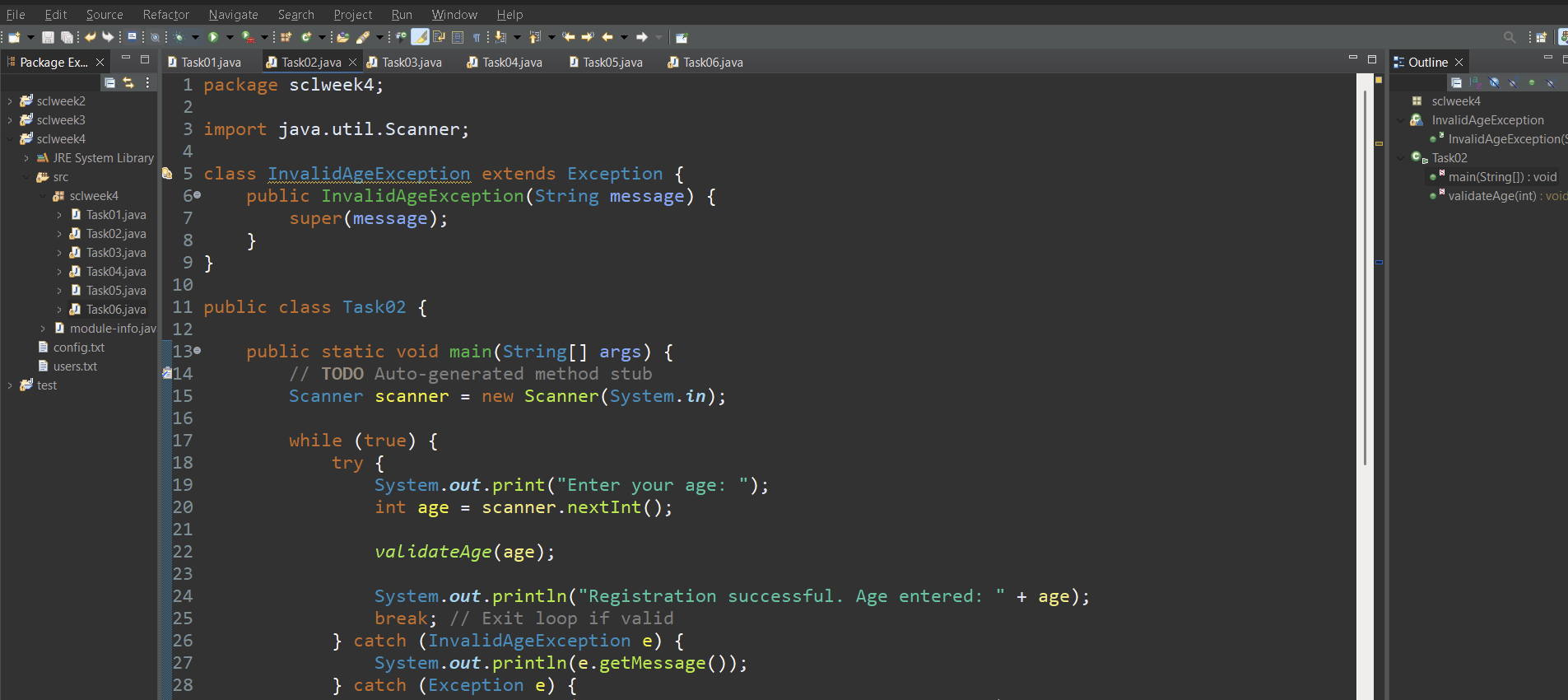 Here our program objective is to validate participant ages and log errors for ages out of the ranges. I start by creating a method InvalidAgeException which will allow the user to show a clear message when the input (age) is invalid.