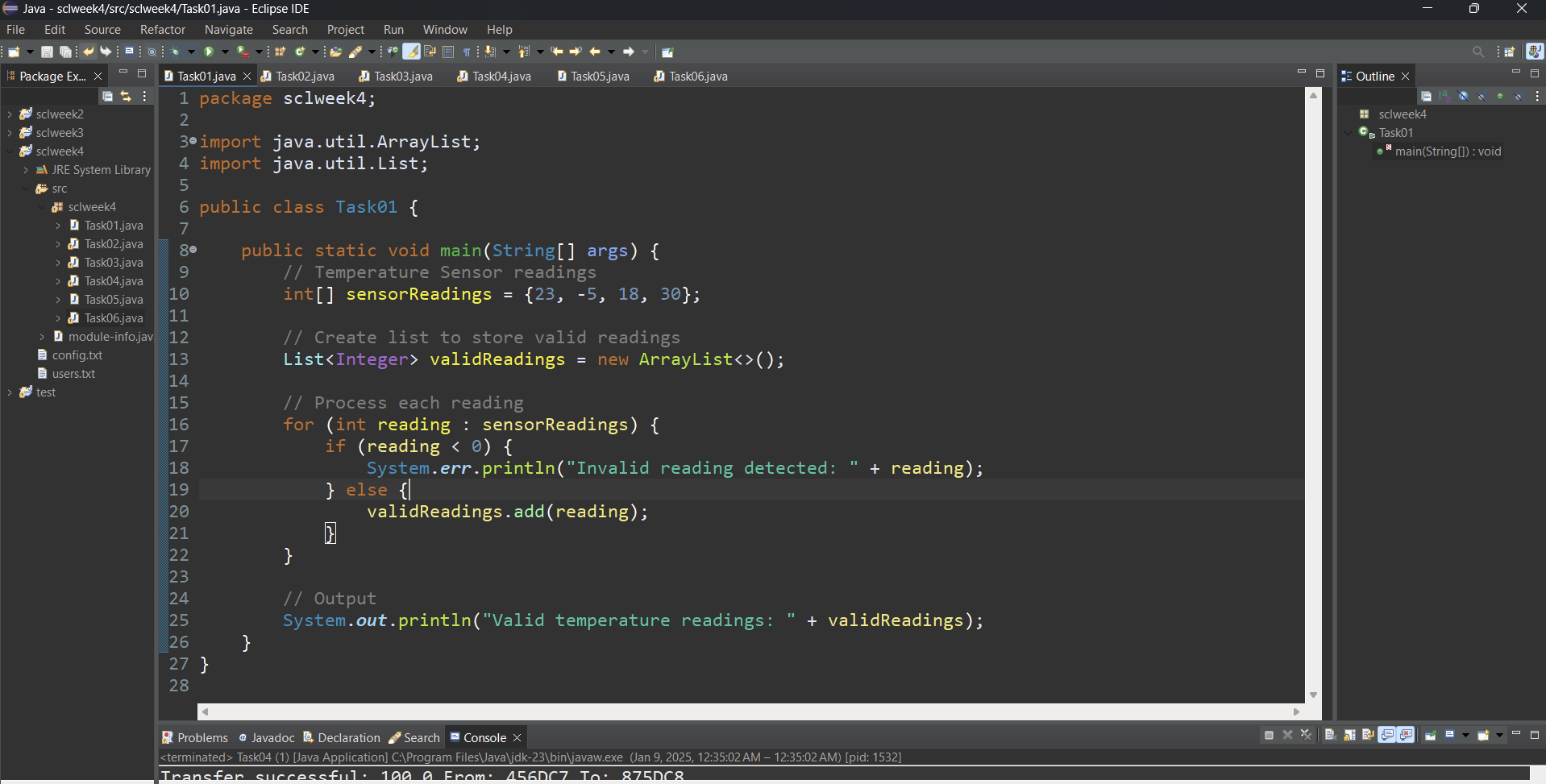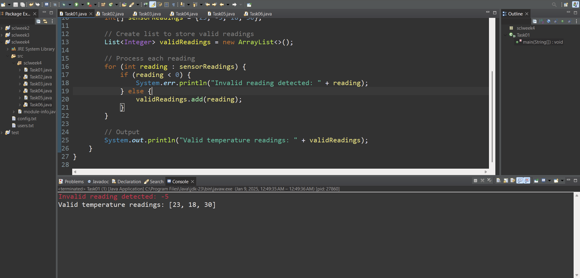 Now, I will go ahead and apply my logic, which is to loop through each element in the array. An invalid reading (negative temperature reading) will log an error message. Using the try-catch block, our program will be able to handle the invalid reading, log the error, and continue running.