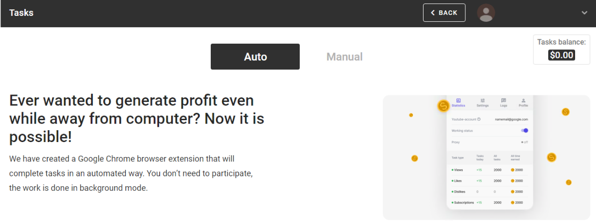 All you need to do is turn on our extension and it will automatically look for tasks and perform them yourself. You can also manually perform tasks, they are on the tab ‘Earn credit - Manual’ in the Task List field. Before you start the task, you will see instructions on how to do it.