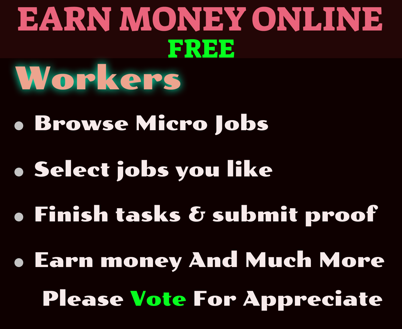 Earn Money Online (Paypal) 2019tahahassan (16)in #earn • 7 years ago Rapid Workers is about connecting people who need something done fast at low costs (Employers) with users who want to help and have a chance to make some quick money as a (Workers). Tasks Like this : VOTE ME FOR APPRECIATION NOW ONLY FOR PAYPAL USERS http://www.rapidworkers.com #rapidworkers #online #jobs #tasks
