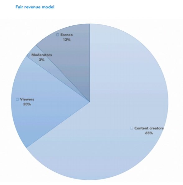 Earneo wants to give back fully to the community where the community will be the only control. The advertising revenue is shared among the moderators with 3%, content creators with 65% and viewers with 20%. Earneo gets only 12% from the advertising revenue.