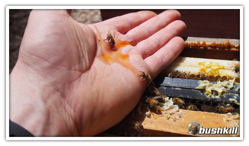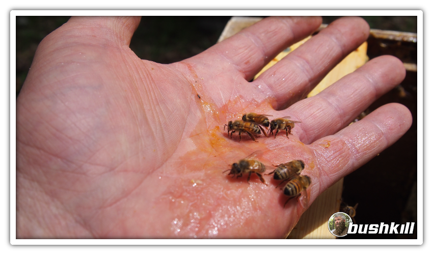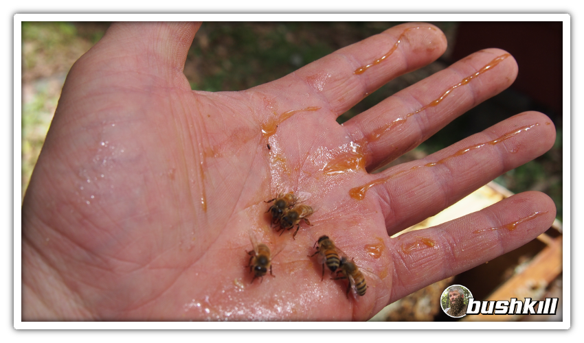 It didn't take me long to realize getting bees into the palm of my hand was not an easy task, especially when there is a nectar flow that they prefer. I tried shaking some bees into my hand, but that just got them riled up and they would immediately fly off.