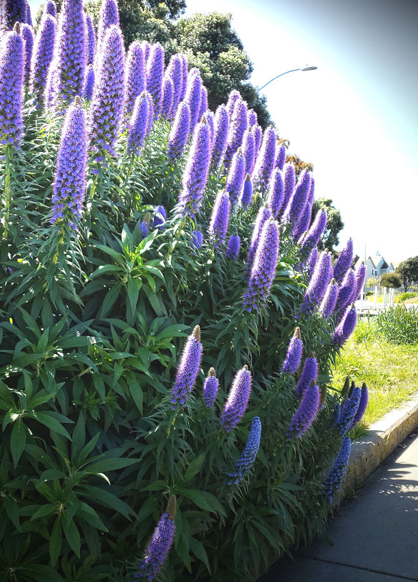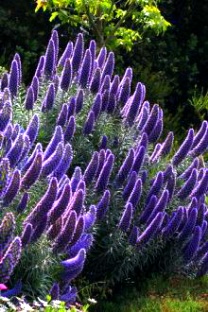 Echium candicans (Pride of Madeira) - A rapidly growing evergreen shrub to 4 to 6 feet or more tall or more by as wide with long, narrow, gray-green leaves held at the ends of the branches. Rising above the foliage in spring on into early summer are the large 20 inch long flower stalks bearing small bluish-purple flowers with reddish stamens. Plant in full sun in most any type of soil and irrigate occasionally to not at all. Once established plants require no additional irrigation in coastal gardens though inland plantings will appreciate occasional irrigation and protection from cold - reliably cold hardy for short durations down to about 25 degrees F and some claim a bit colder. This is a great plant for mild coastal climates and seaside gardens on a slope or in an area with room to spread out and it is attractive to honey bees, hummingbirds and butterflies, but unpalatable to deer and other browsers. Pride of Madeira often reseeds itself in the garden and, as this plant is relatively short lived (generally 4-6 years but some living up to 10 years), allow seedlings to replace older woodier plants. Prune flower inflorescences off after flowering to tidy up the plant and cut back hard in late fall to reduce size and encourage new growth from lower branches - leaves have slightly irritating hairs so remember to wear gloves when handling.
