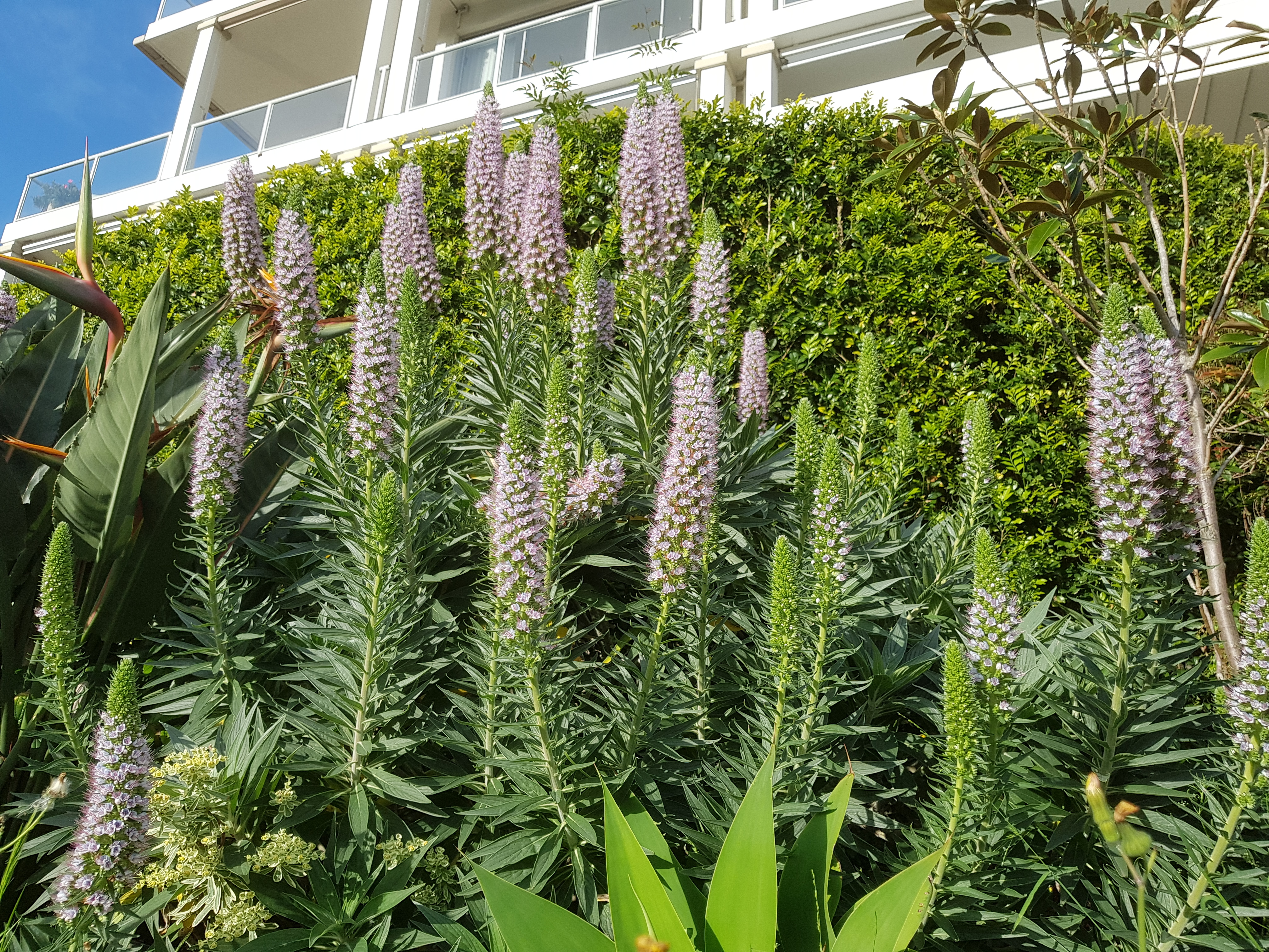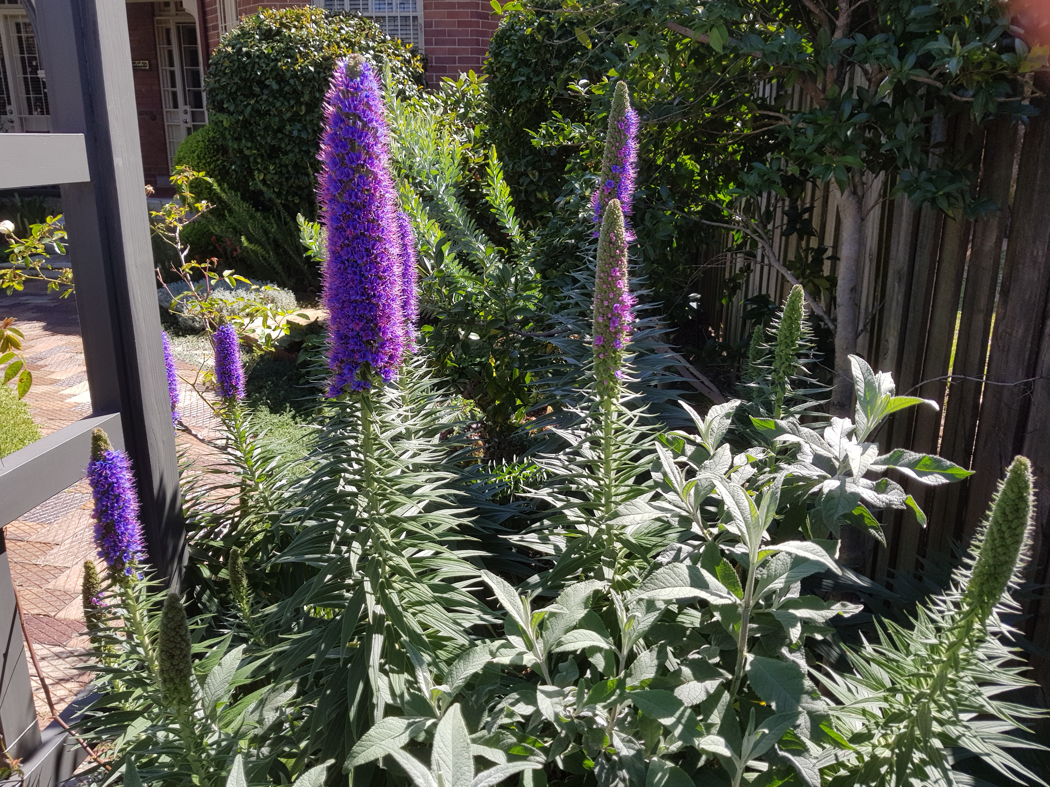 There are a number of varieties of Echium, and they are all spectacular when in flower, adding a distinct shape in a garden which contrasts to other plants. The plants grow to around 2.5 metres tall, and around 2 metres wide, and are drought tolerant once established. The best climate for these is temperate to warm, preferably with low humidity, although Sydney can be quite humid in Summer, and these plants still look good. Plant them in a position with full sun and well drained soil. Prune off old flower heads and leggy stems to keep the plant compact. They grow fast, so they will look good again in no time.
