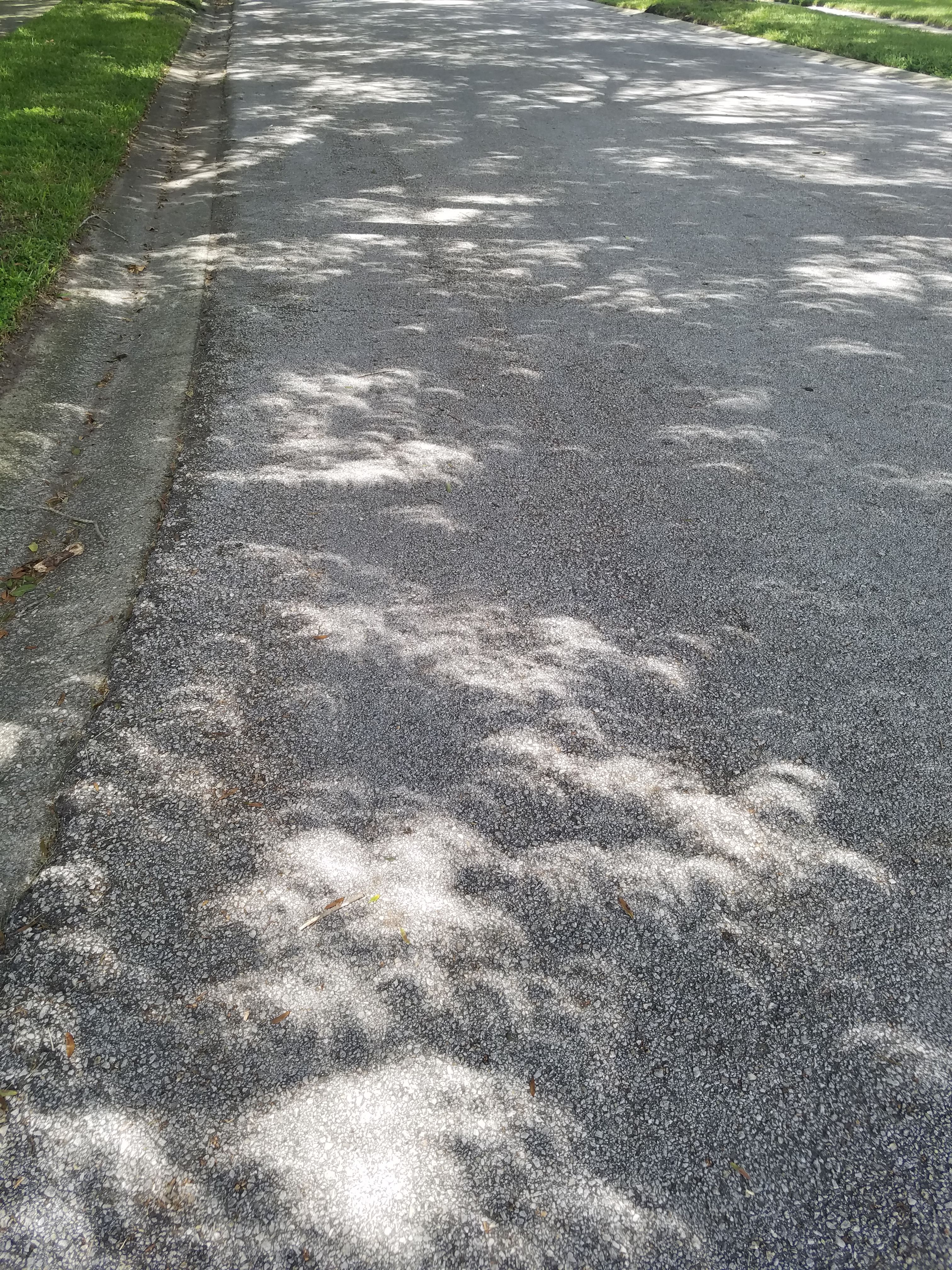 These photos were taken during Monday's solar eclipse. During the time the moon overlapped over the sun to make the sun look like a crescent it also caused it to make crescent reflections between the trees on the ground. Awesome!