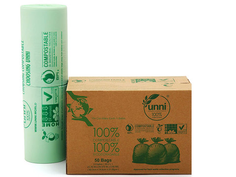 These trash bags are 100% compostable, meet the stringent requirements of municipal composting programs, and are BPI certified. For reference, they're almost half the price of Glad bags (also 13 gallon, also 50-count).