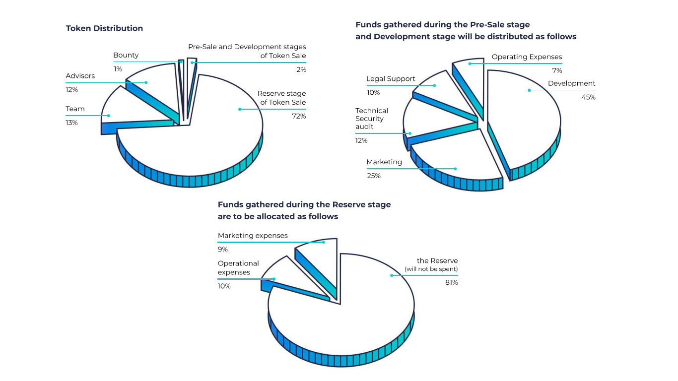 eCOINOMIC.net collected fund divided 2 stages. first fund gathering during pre-sale and development stage is mostly used for development of the project and the fund gathering during reserve stage will be used mostly for the reserve. for the distribution the token will be distributed for reserve stage of token sale is around 72%, presale dan development stage of token sale (2%), Bounty (1%), advisors (12%), Team (13%).