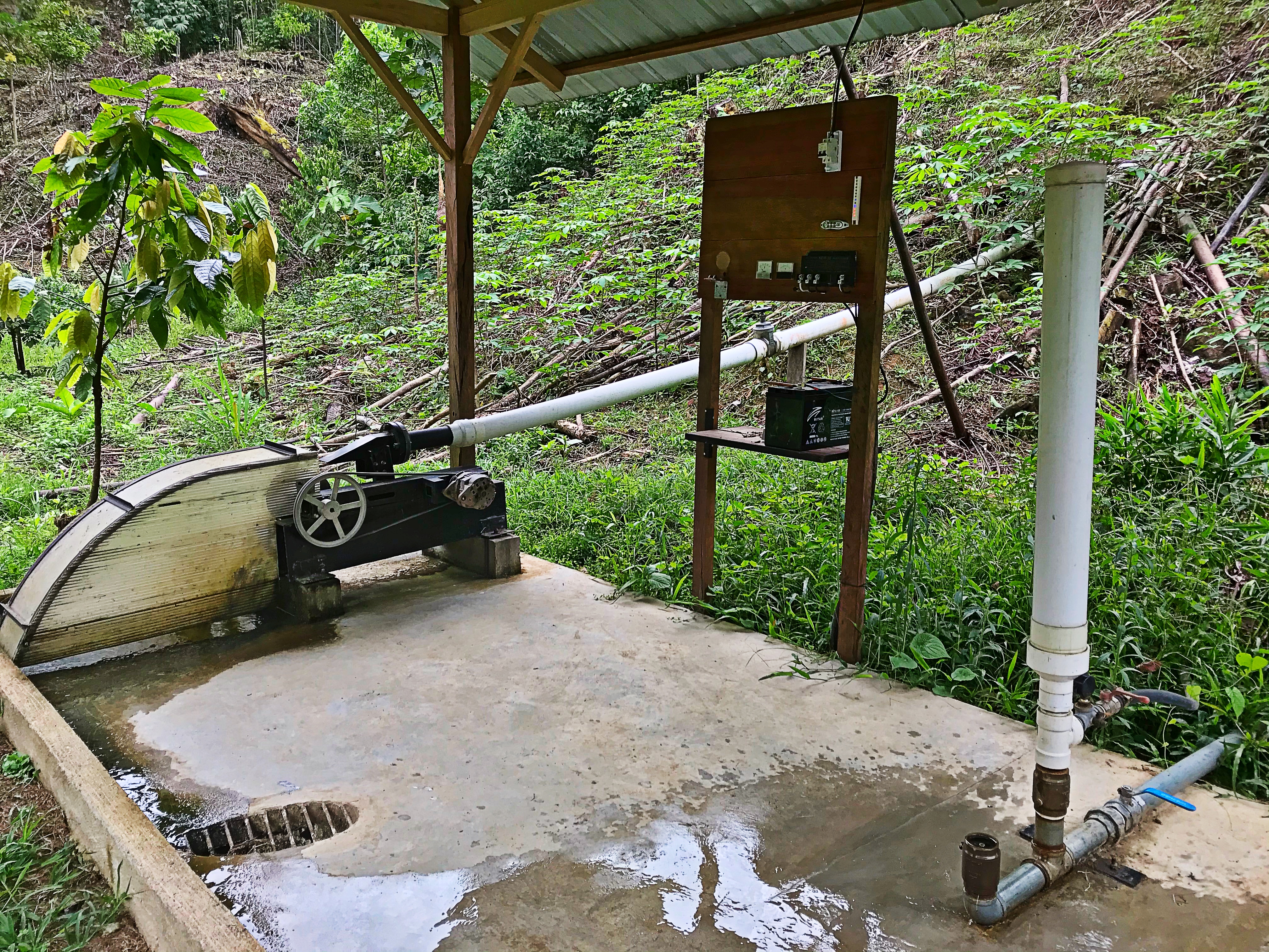 The compost toilets have an added foot mixer for when your done doing your business, you simply step on the four pedal a few times to mix up the wood chips and Poo to craft an aerobic environment which takes care Of the smell we all know. The other addition is a tube that drys the to-become fertilizer so that the bacteria is killed off. Again another Eco-system very necessary sustainability and for living in the jungle. The solar power is connected to all of the facilities powering most of them, next to the solar panels is a demonstration unit that has a range of lights that tells how much power is being collected, his educational demonstration is having you keep your eyes on the lights and simply puts his hat on the solar power unit to watch the lights go down, indicating that solar power is instant. Right next to the solar power is a mini hydroelectric unit and RAM pump all for educational purposes.