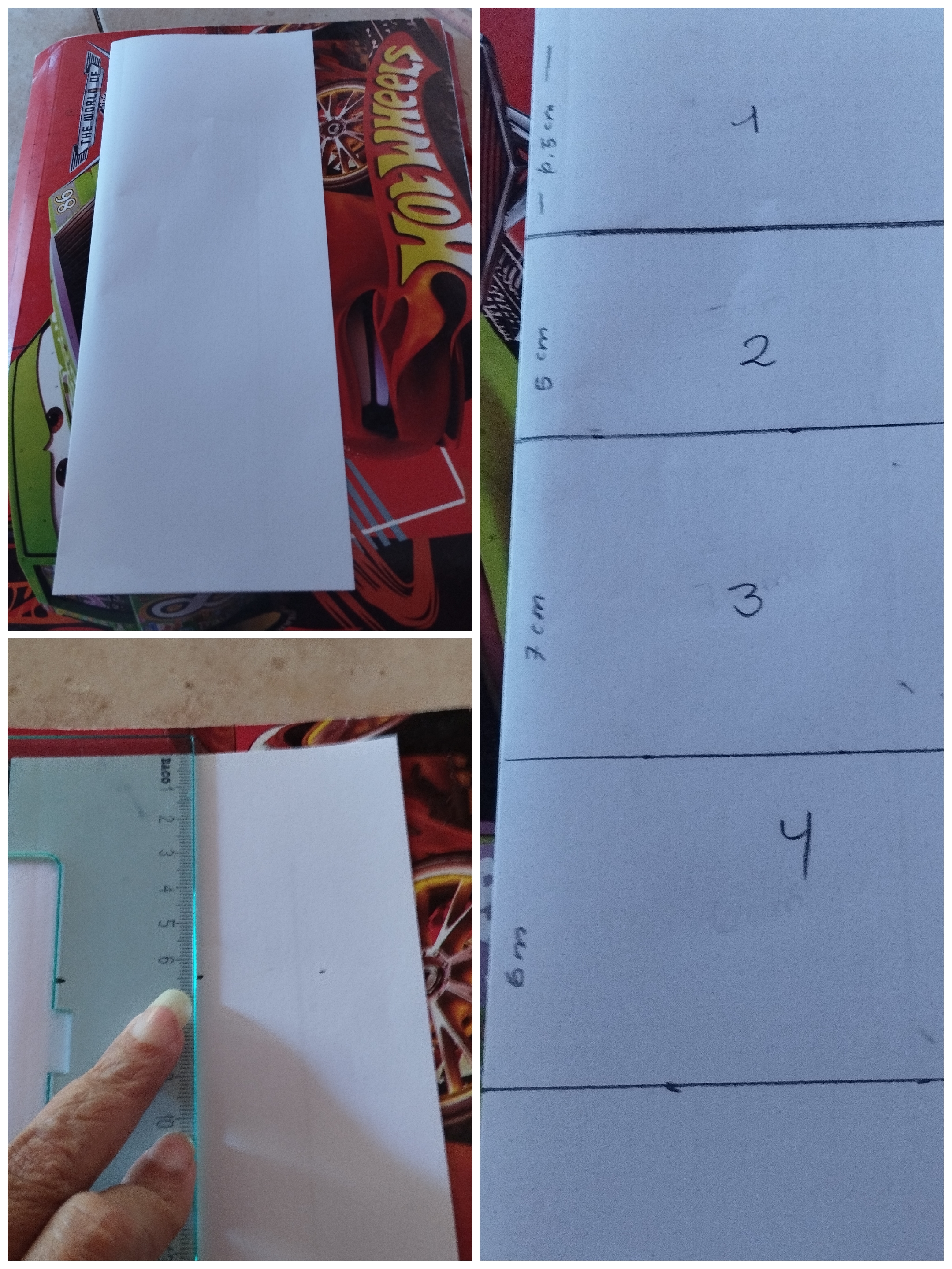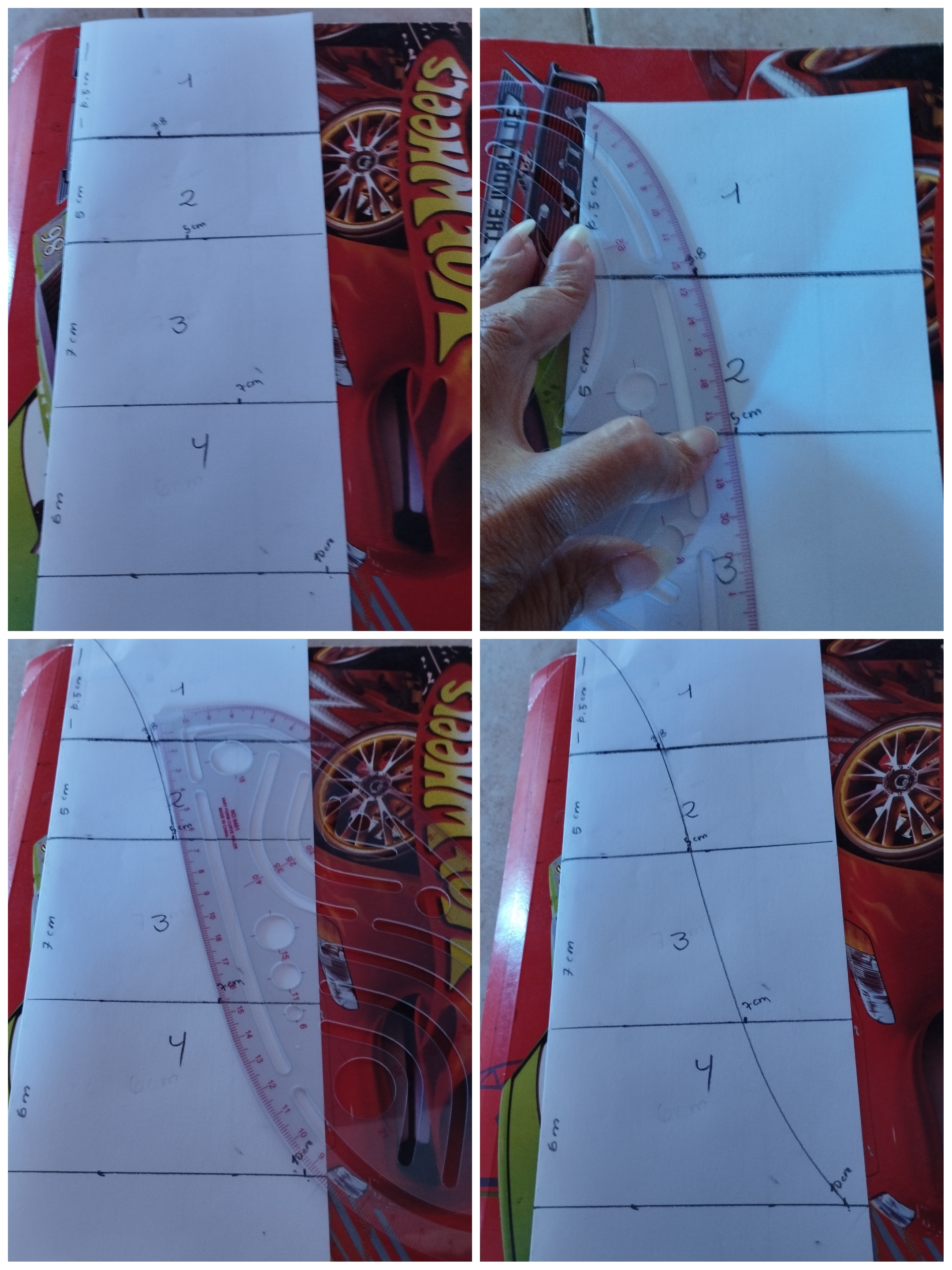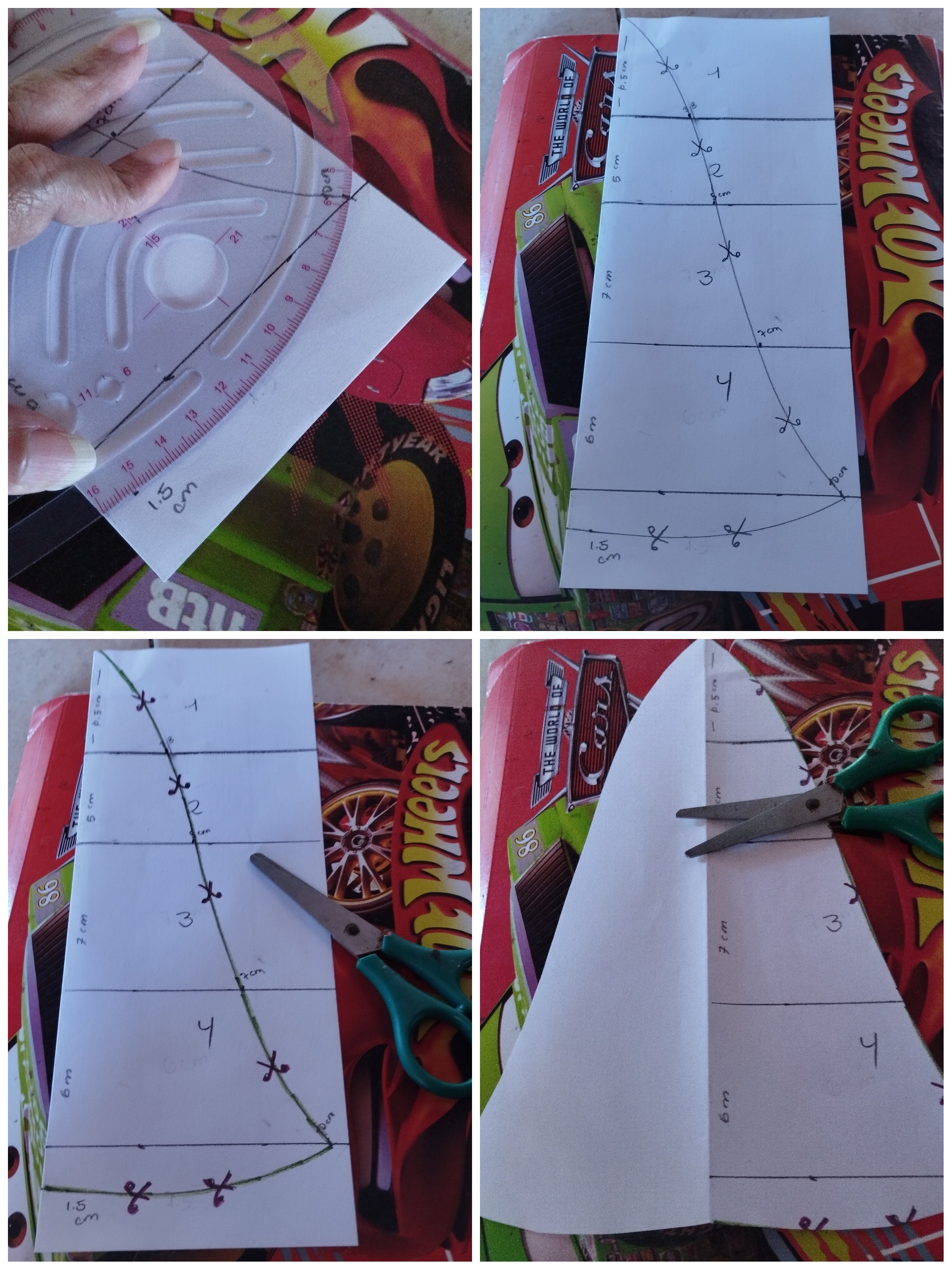 Inicié doblando una hoja blanca tipo carta, esto facilita el patronaje, obtención del molde completo. Usé medidas asignadas, con ayuda de una escuadra ubiqué los puntos en modo vertical, separando con líneas.