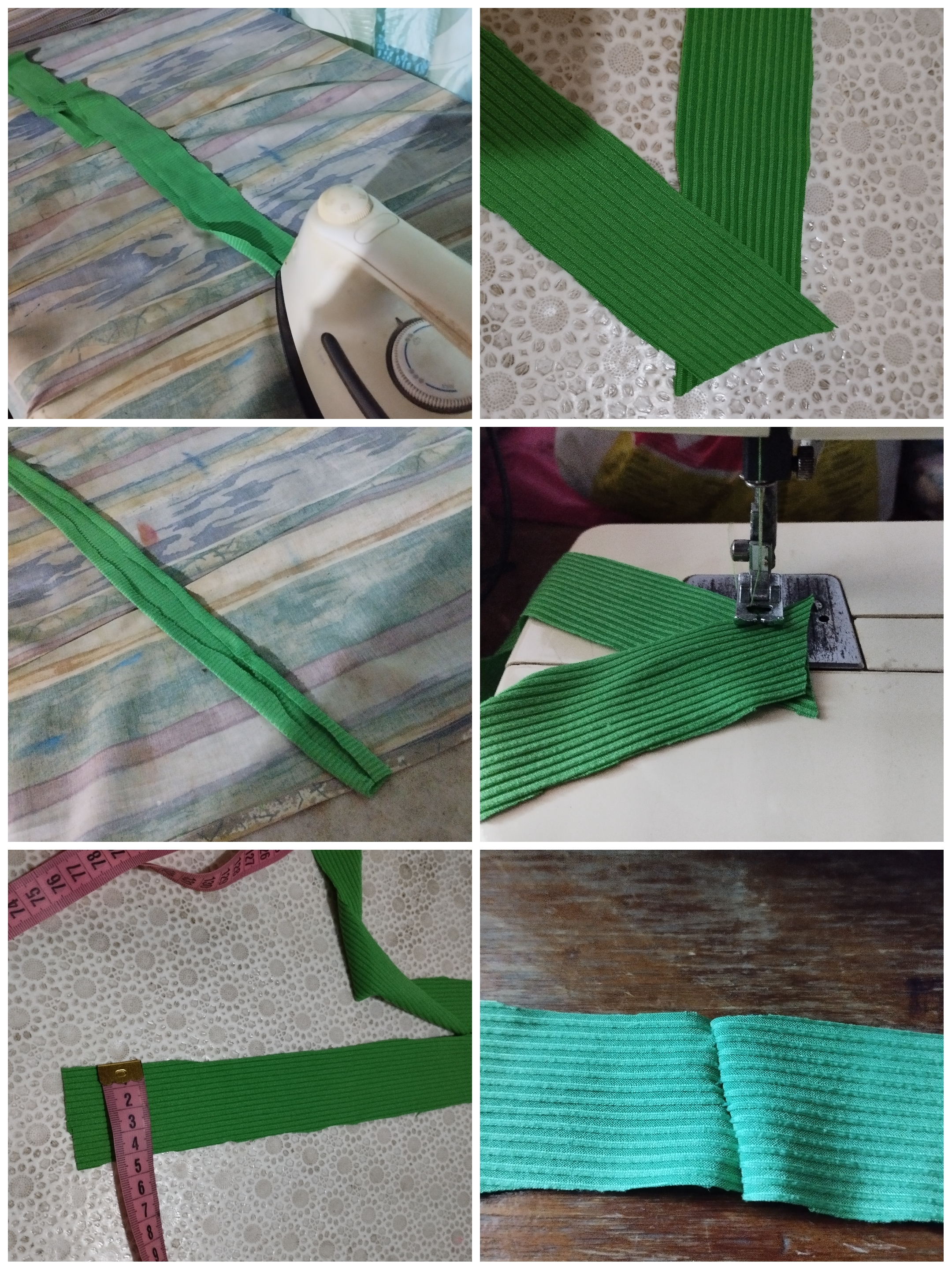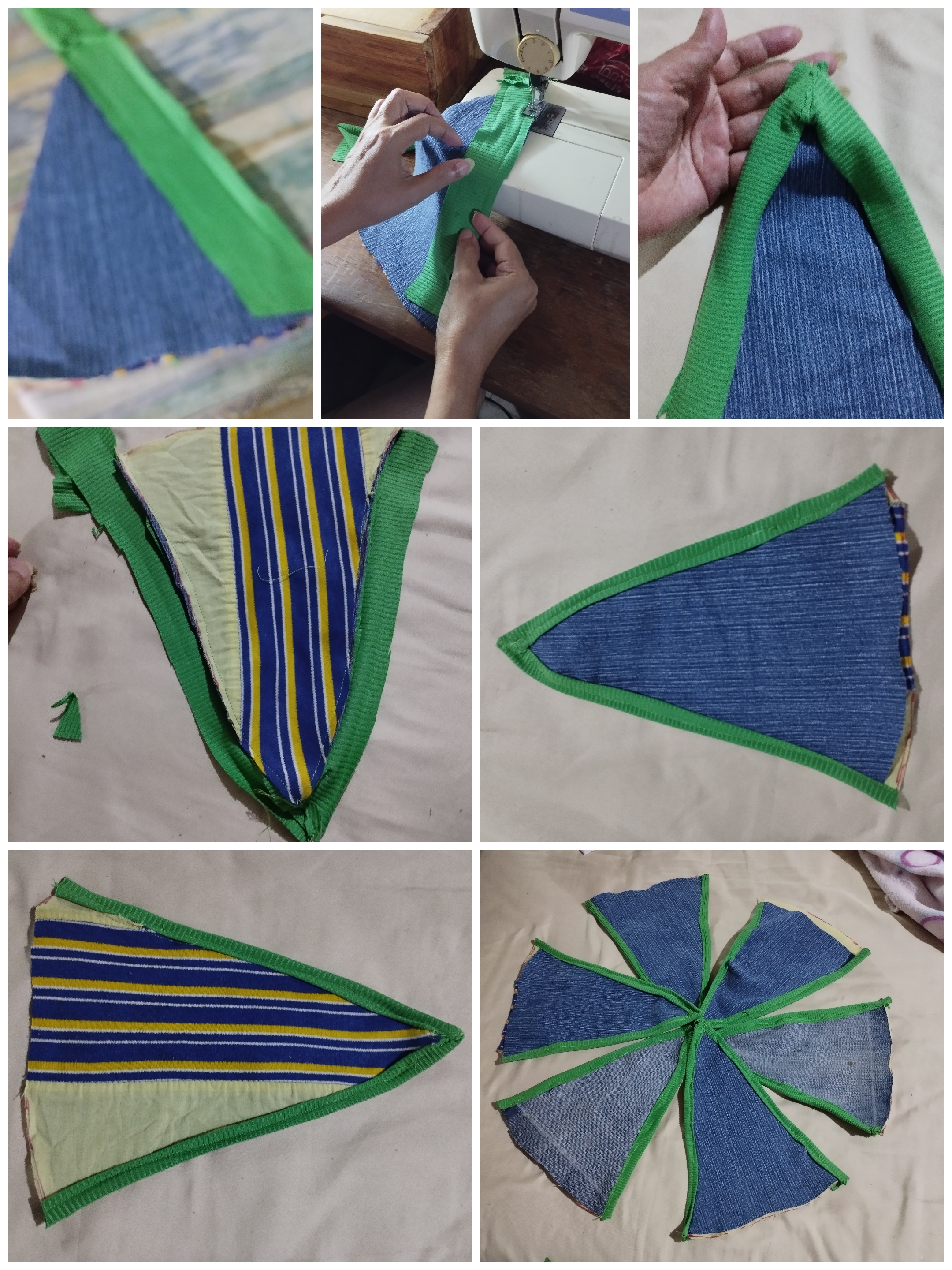 Una vez que la cinta al bies estuvo lista, empecé a colocarla en cada lado de las seis piezas. Con los lados del revés juntos, de manera que cada pieza tenga un lado del derecho hacia afuera.