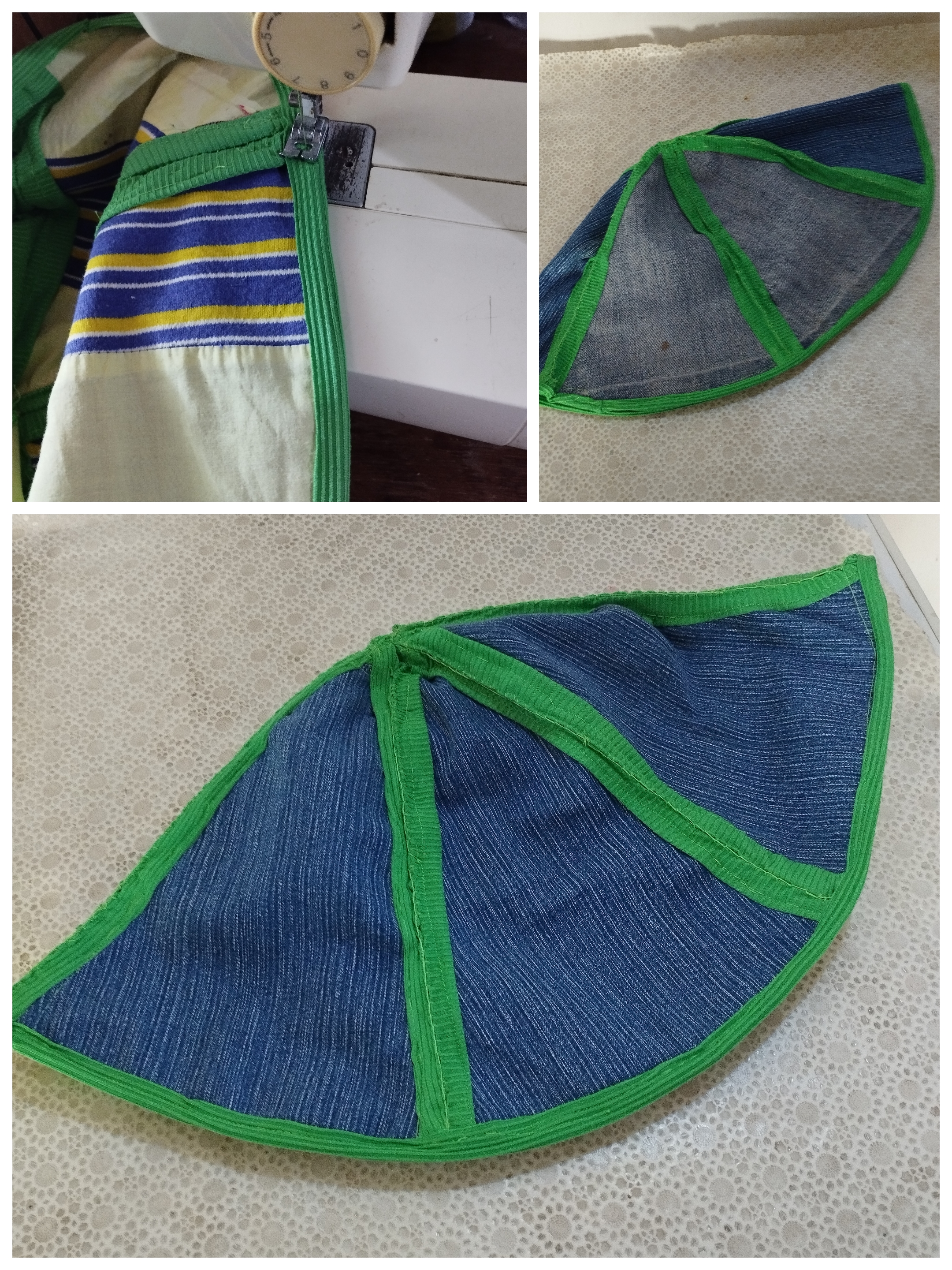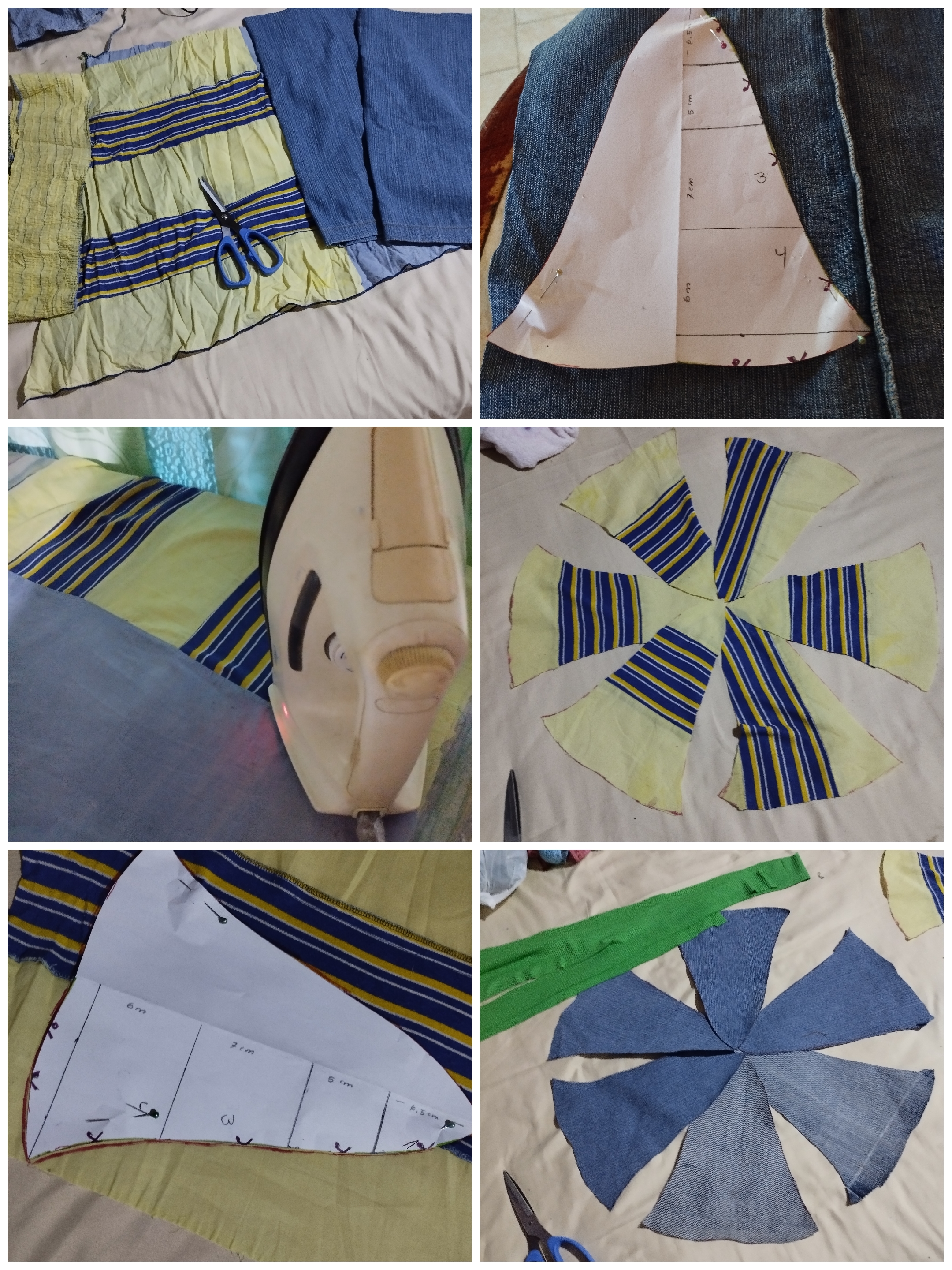 Seleccioné tela de jean, unas botas de un viejo pantalón, igual un gran retazo de tela de un viejo vestido, adicional retazos de tela verde, planché las telas. Marqué el molde en las telas y obtuve 6 campanas de cada tela, un total de 12 piezas y las planché.