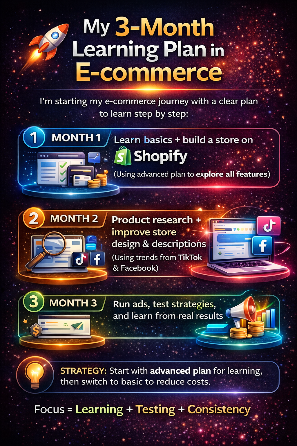 This 3-month plan is designed to help me learn, test, and grow in e-commerce. Instead of rushing for quick results, I am focusing on building skills that will help me succeed in the long term.