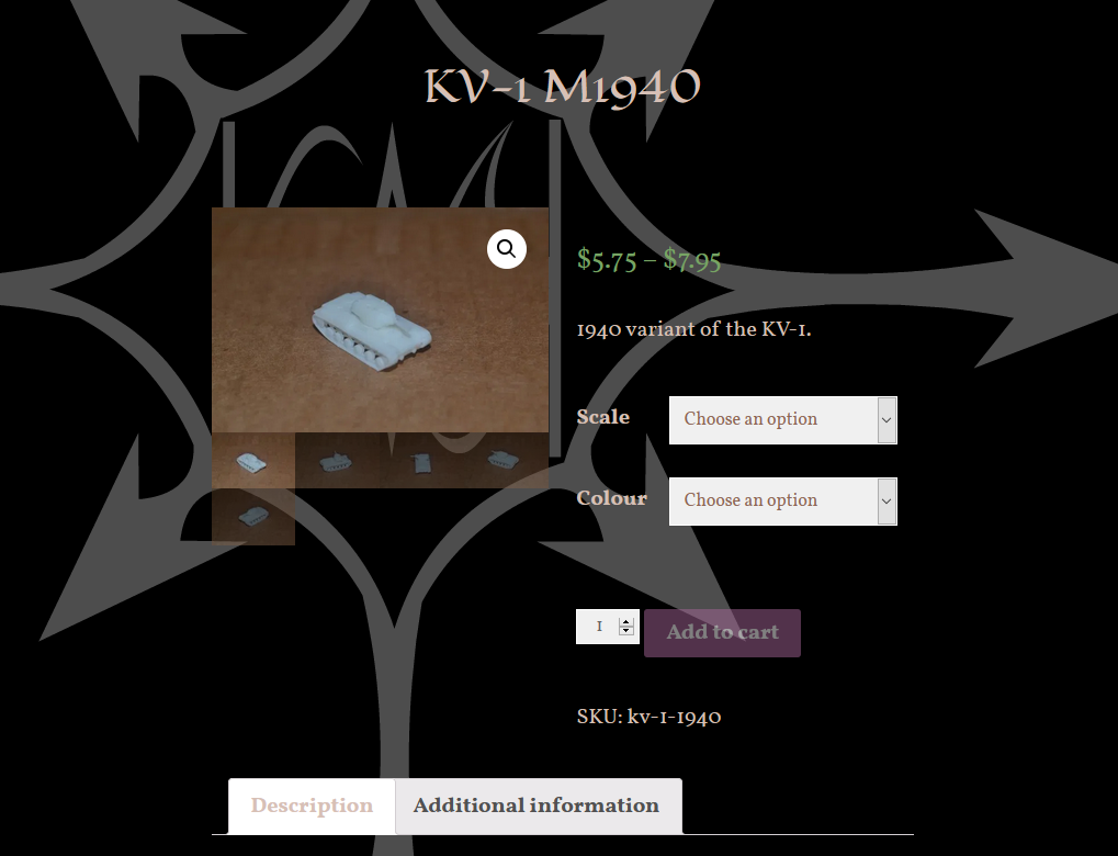So far, the only scale options are 1:285 and 1:220. The only colour options are white and dark olive. I have plans on adding 1:240 scale, beige, and grey, and I may eventually go up to 1:200 scale, but I won't offer the current models in a larger scale than that. In order for me to even consider offering larger scales, I would have to make these models much more detailled.