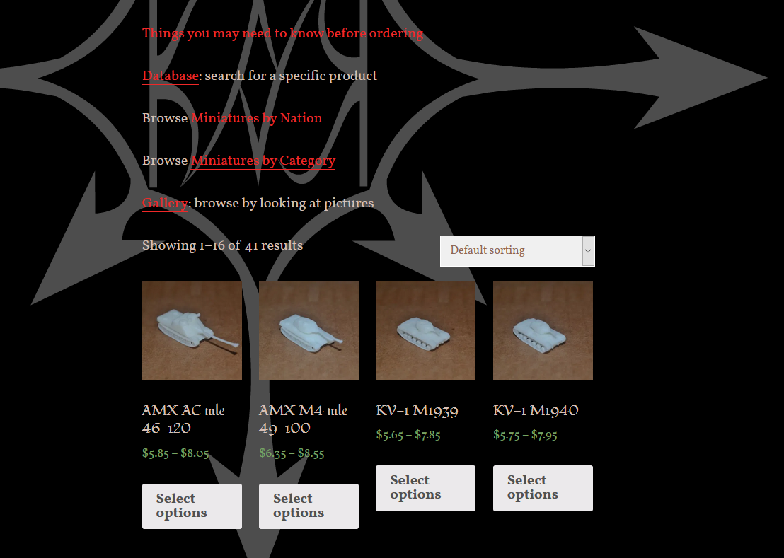 For those of you who visit my online shop, you may have noticed a change I made to the homepage, indicating that I would be adding options such as scale and colour. I started doing this last week, but because of interruptions (mainly getting a nasty cold), I wasn't able to resume until today. When you visit the shop page now, this is what you will see: