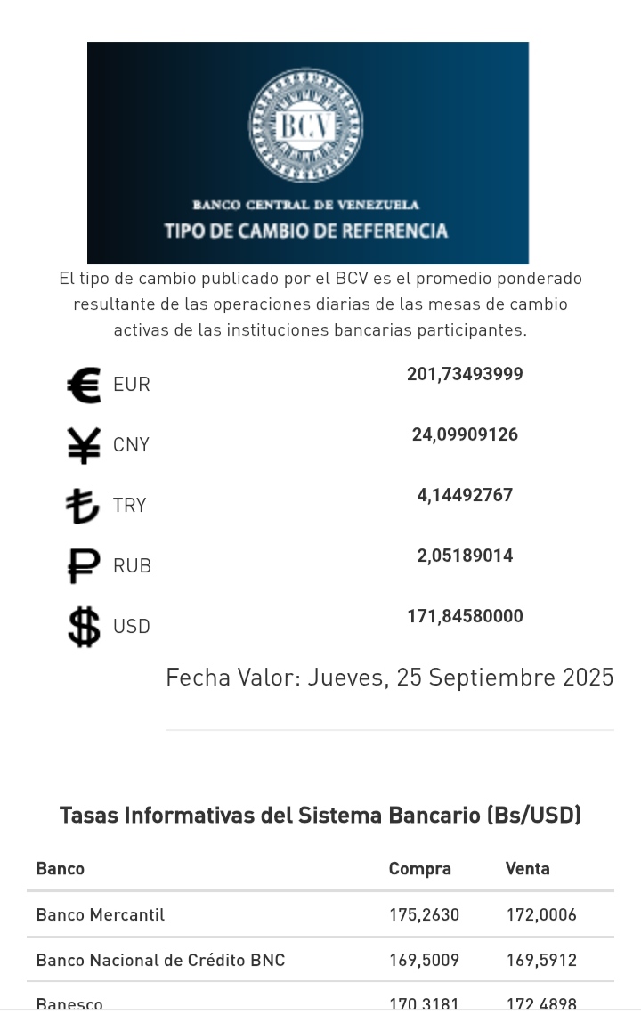 Y asi va el valor del dólar 💵💲 este día 25 de septiembre del año 2025, 171.85 bs por dólar, estuve revisando cuánto estuvo, el año pasado en esta fecha y estaba a 36.81 bs por dólar lo que quiere decir que en año subió casi 5 veces el valor, sin aumento de salario, ni nada, ninguna economía y menos la de una familia aguanta está situación.