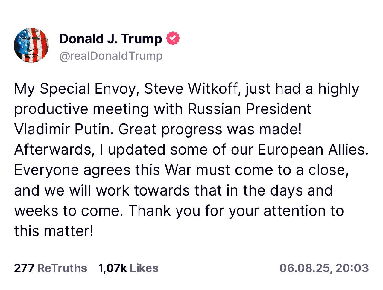 Президент Трамп сообщил, что Уиткофф провел успешную встречу с Путиным: