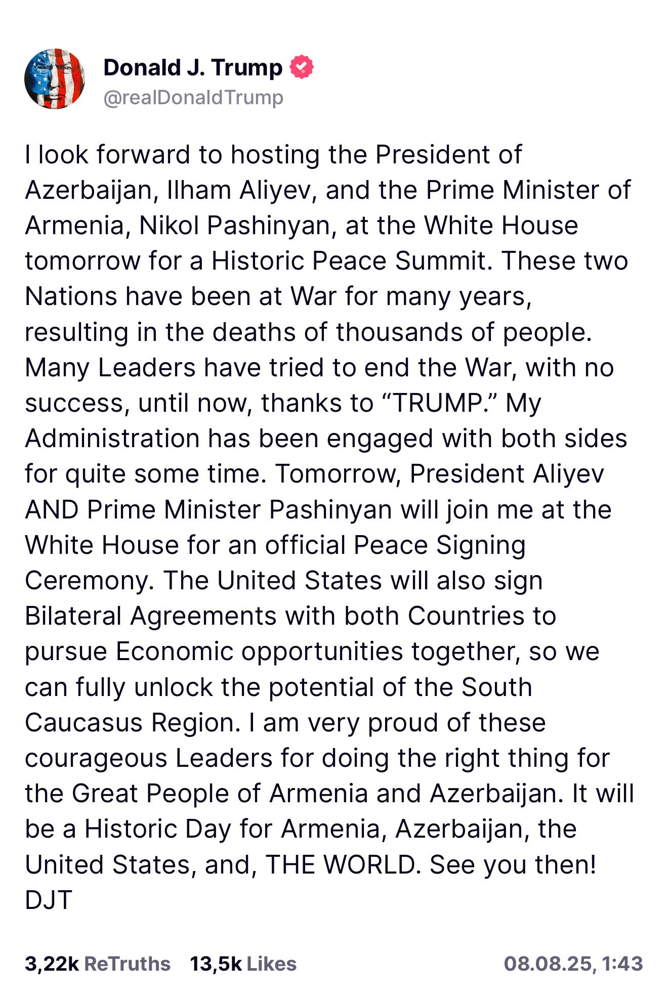 Как сообщил политик в своём постов, в пятницу лидеры Азербайджана и Армении примут участие в церемонии в Вашингтоне, где заключат соглашение о мире. Кроме того, США планируют заключить отдельные торговые договорённости с обеими странами для укрепления экономических связей в Карабахском регионе.