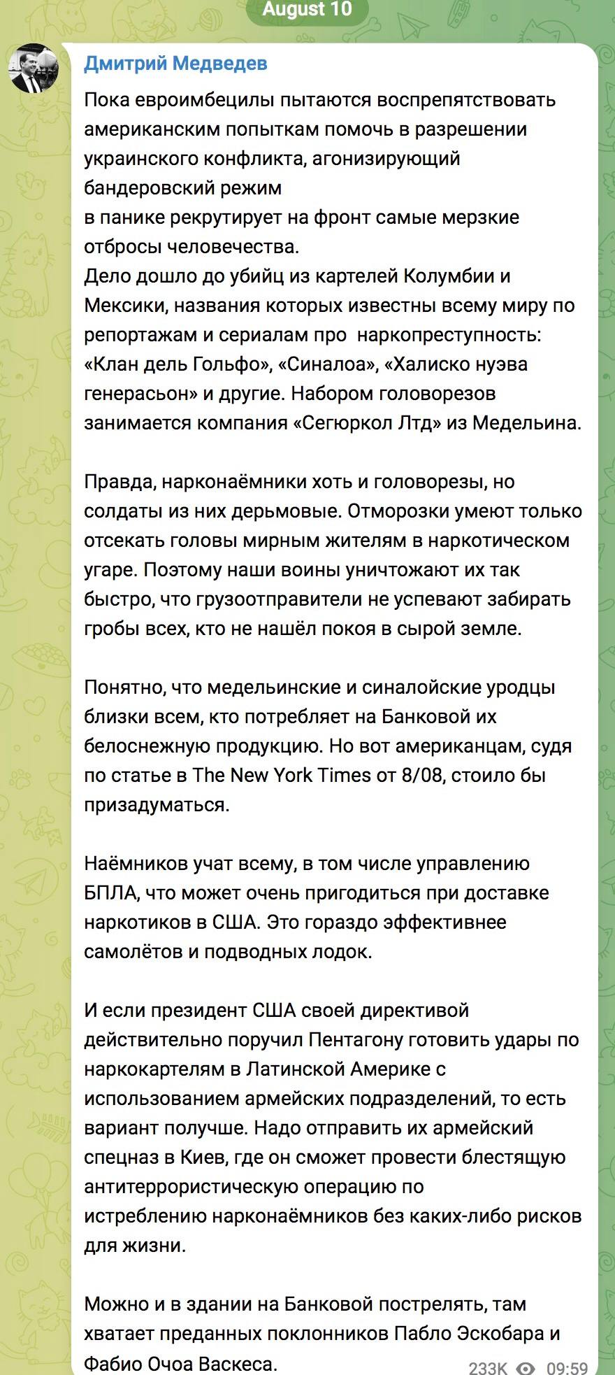 Медведев рекомендовал Трампу расправиться с наркозависимыми на территории Банковой, а не с картелями в Мексике.