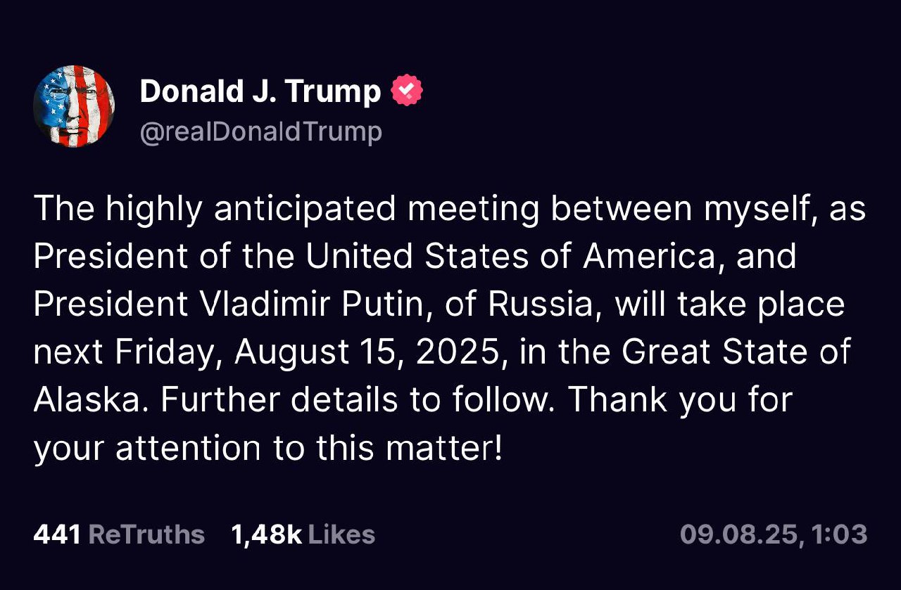 ⚡️ Дональд Трамп объявил о своем намерении провести встречу с Владимиром Путиным 15 августа на терри