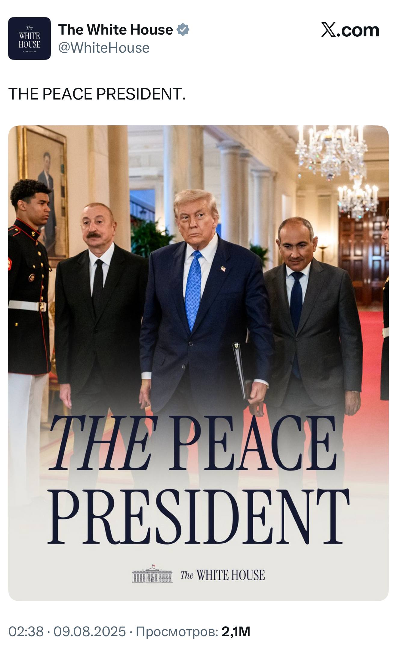 Белый дом презентовал плакат «Глава 평화» после signing мирного соглашения между Арменией и Азербайджа