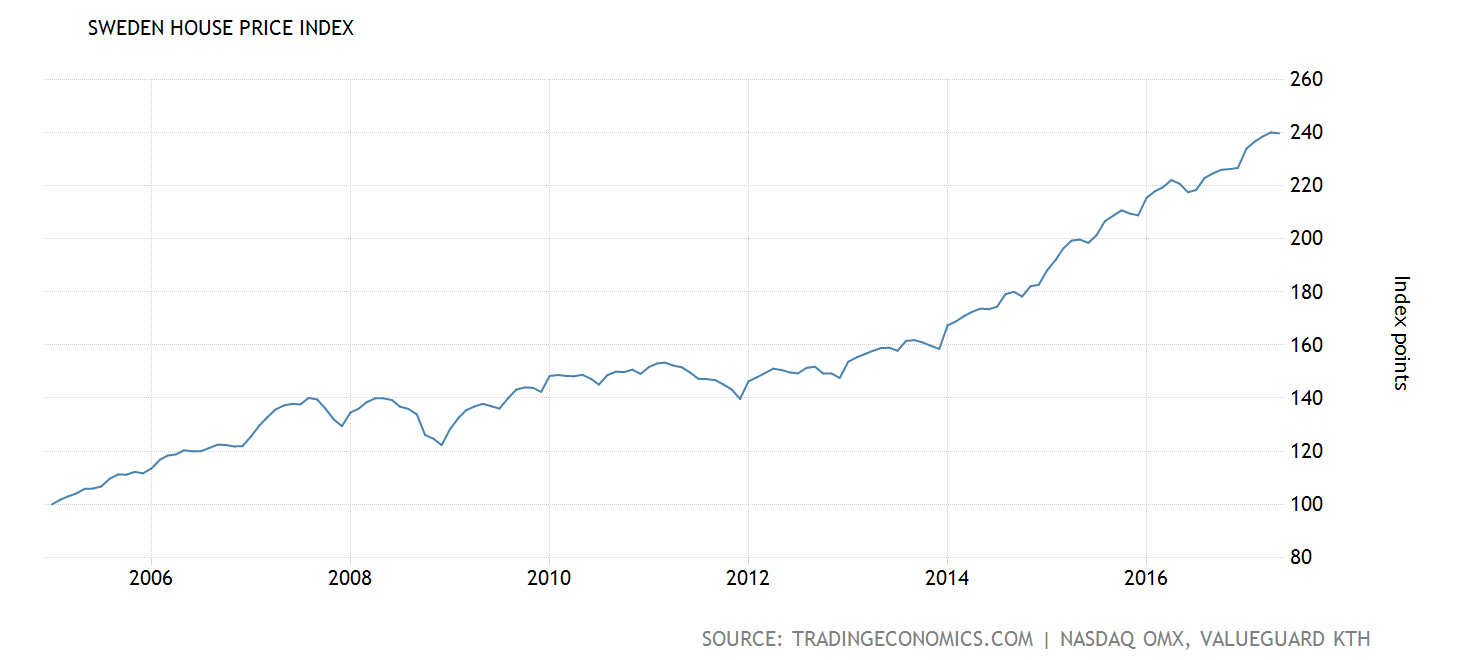 - Housing Market: Overprizing in Canada, California and Sweden. Especially in Sweden the housing prices rose by almost 50% since 2008. Thanks to the monetary policy of the Central Bank Sweden didn't feel a big recession and also thanks to high population growth and low mortgages rates the housing prices will keep on climbing. A reference index below: