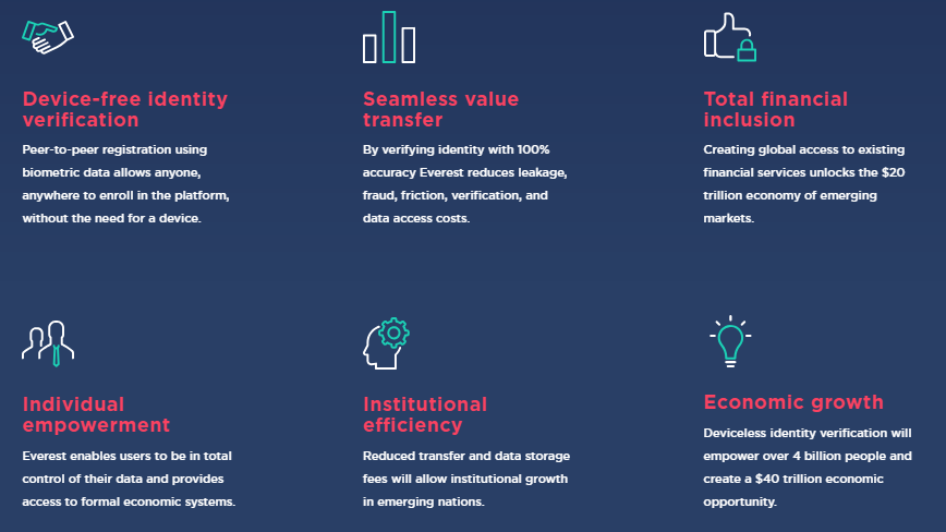 The barriers Everest is the world’s only device-free globally accessible, digital transaction protocol with built-in identity. Through the use of digital identities, digital wallets, document management, and biometrics, users will be able to digitally verify their identity for public services and claim their social and economic rights.