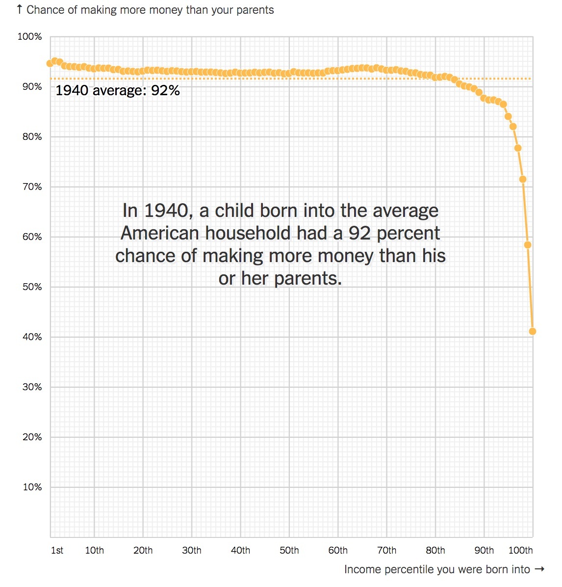 Only 50% of people born in 1980 will be able to earn more than their parents. For those born in 1940, this figure was 92%, due to the explosive growth of the economy after the great depression. But since the 1950s this figure is rapidly falling.