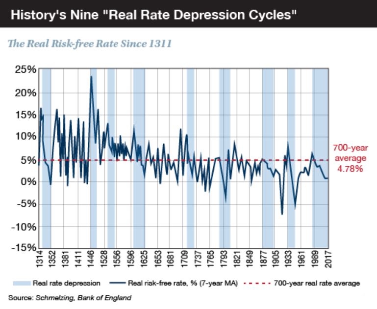 Over seven centuries, Schmelzing identifies nine “real rate depression cycles.”