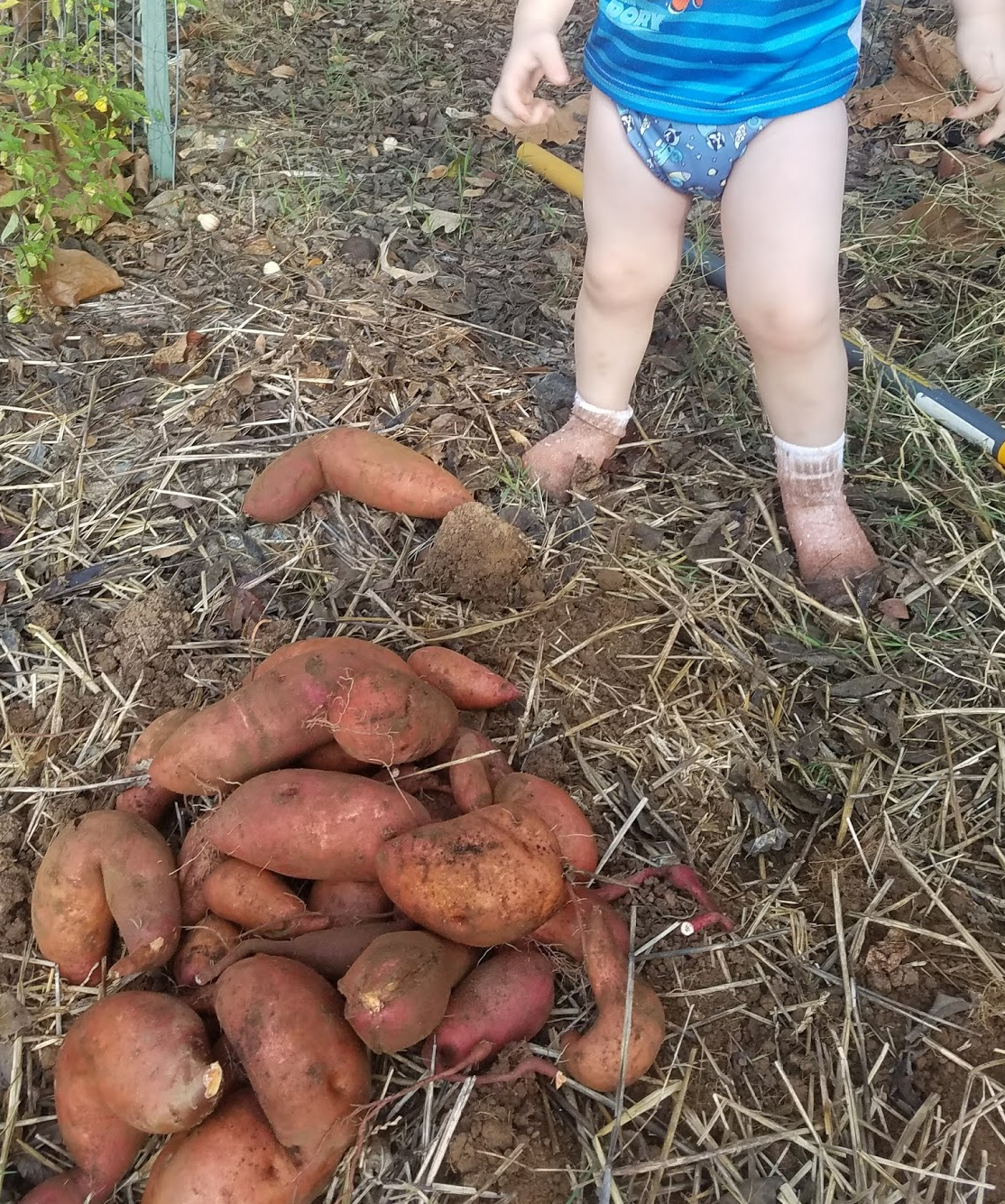 one of the brood rocking a dog-in-space Grovia, may need those socks to be laundered after digging up sweet potatoes