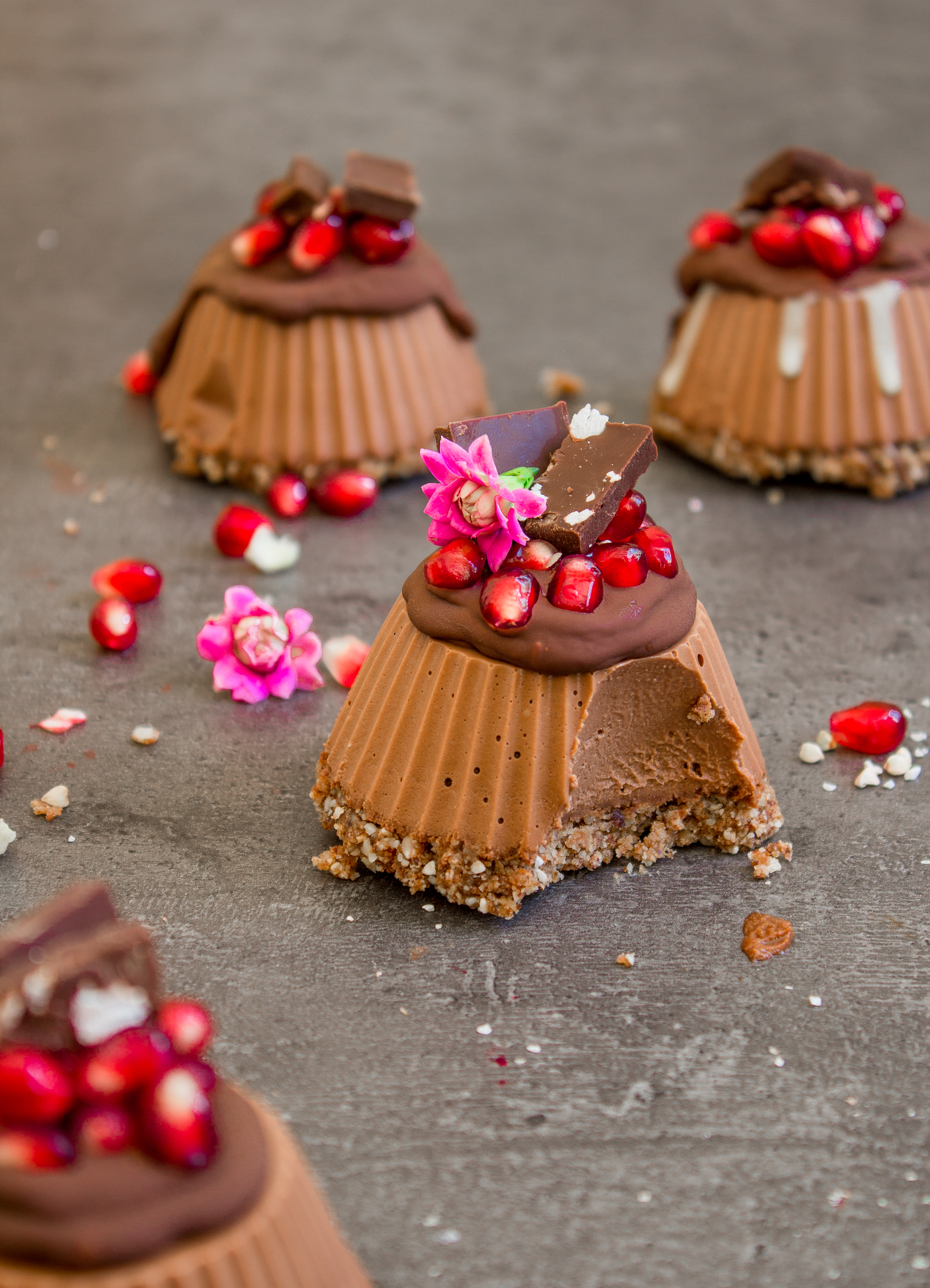 My recipe today for you all is an absolute chocolate bomb! I am so happy how they turned out! Perfect smooth chocolate filling on a crispy crust made of cinnamon granola! To make it even more delicate, I added some chocolate for the decoration together with some pomegranate seeds. PURE HEAVEN!!