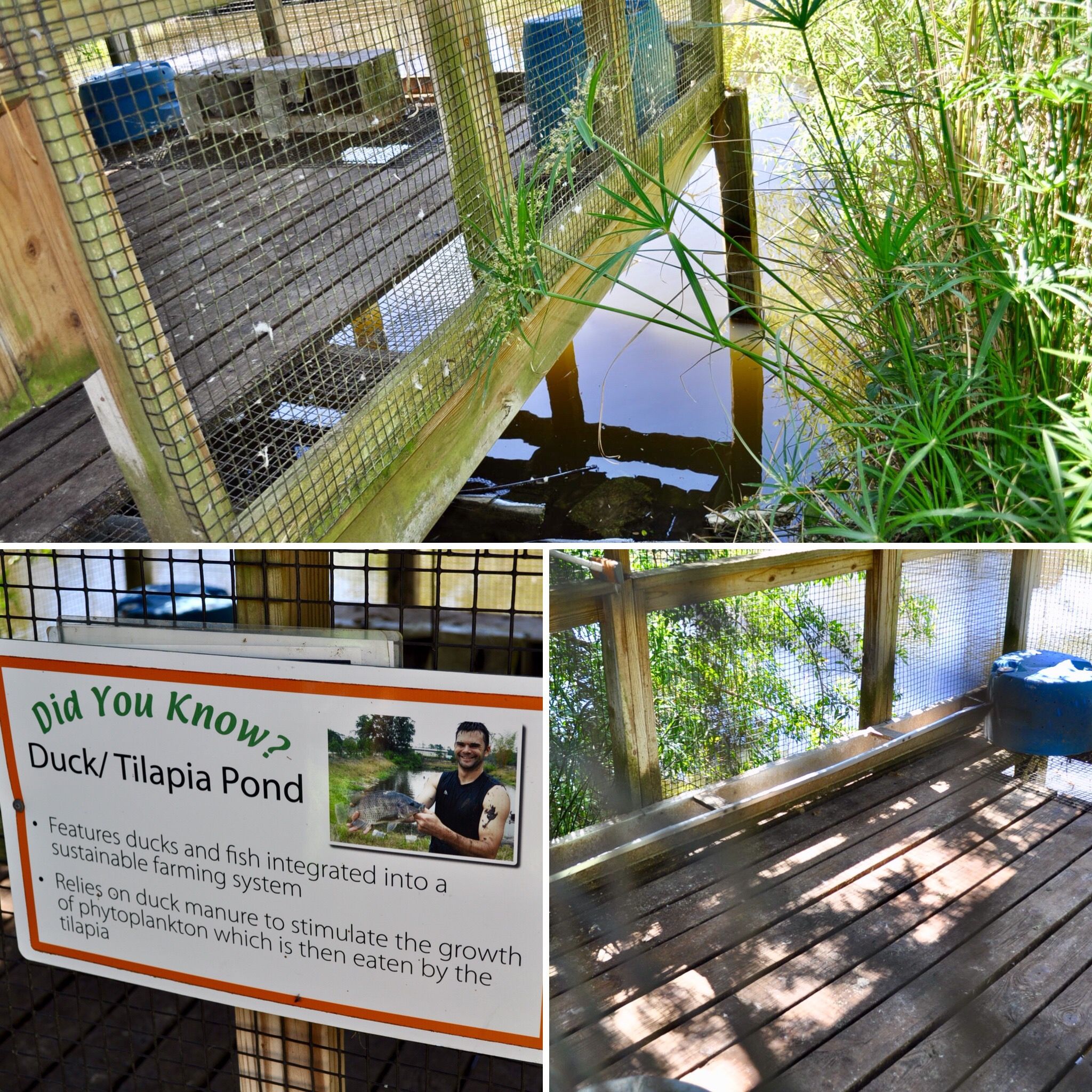 The pond was showcasing a good example of an integrated food system. The bird's coop was located above the pond that was host to duckweed and other aquatic plants. The ducks (who provided eggs and meat) ate plants and insects from the pond and their manure fertilized the plants which fed the tilapia (which was harvested twice a year). There was no mention of edible human plant foods, but certainly lotus or water chestnuts could be integrated as well. This is a good example of using a "waste" as resource.