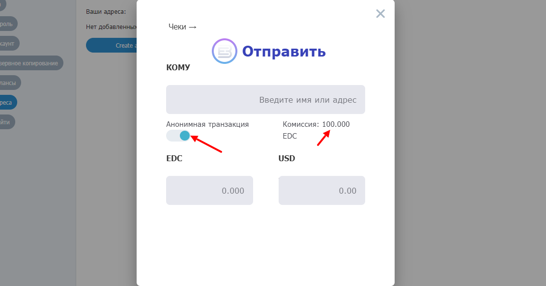 Но имеется в EDC Blockchain и функция отправления полностью анонимных транзакций. Правда у неё есть один нюанс – комиссия за такую транзакцию в разы выше обычной и составляет 100 монет EDC – это единственный случай в использовании системы EDC Blockchain, когда цена транзакции и комиссионный сбор отличается от стандартного.
