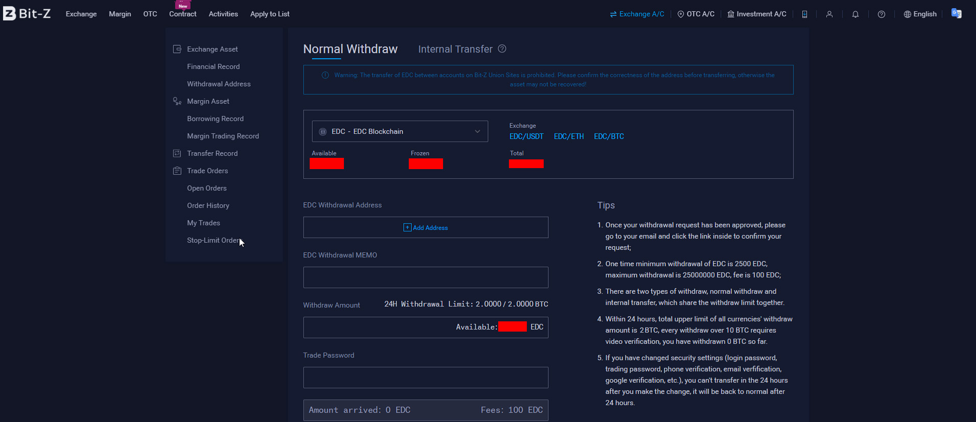 После того, как нам присвоят первый уровень верификации, мы сможем выводить валюту с биржи на сумму эквивалентную 2 BTC в сутки. После этого мы можем уже непосредственно приступить к выводу валюты. Переходим снова на страницу “Exchange Asset”, в поиске пишем “EDC” и жмем кнопку “Withdraw”.