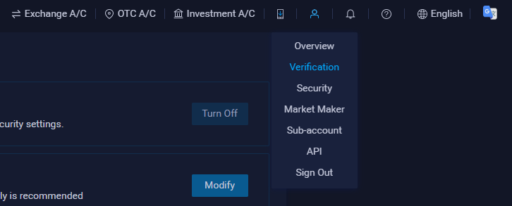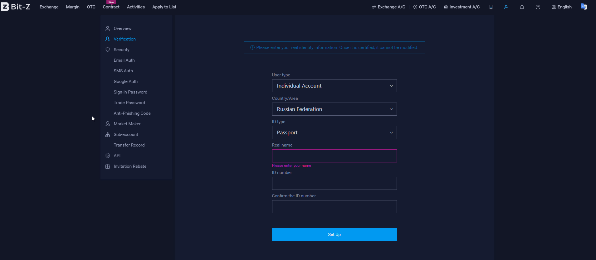 Теперь для вывода нам осталось только пройти первый уровень KYC. Кликаем на значок человечка в верхнем правом углу и в выпадающем меню выбираем пункт “Verification”. В полях указываем по порядку – “Individual account”, свою страну, тип документа для подтверждения личности, реальное имя и номер документа (серию и номер паспорта, если вы из СНГ). После чего нажимаем кнопку “Set Up” и ждем некоторое время, пока система проверит наши данные.