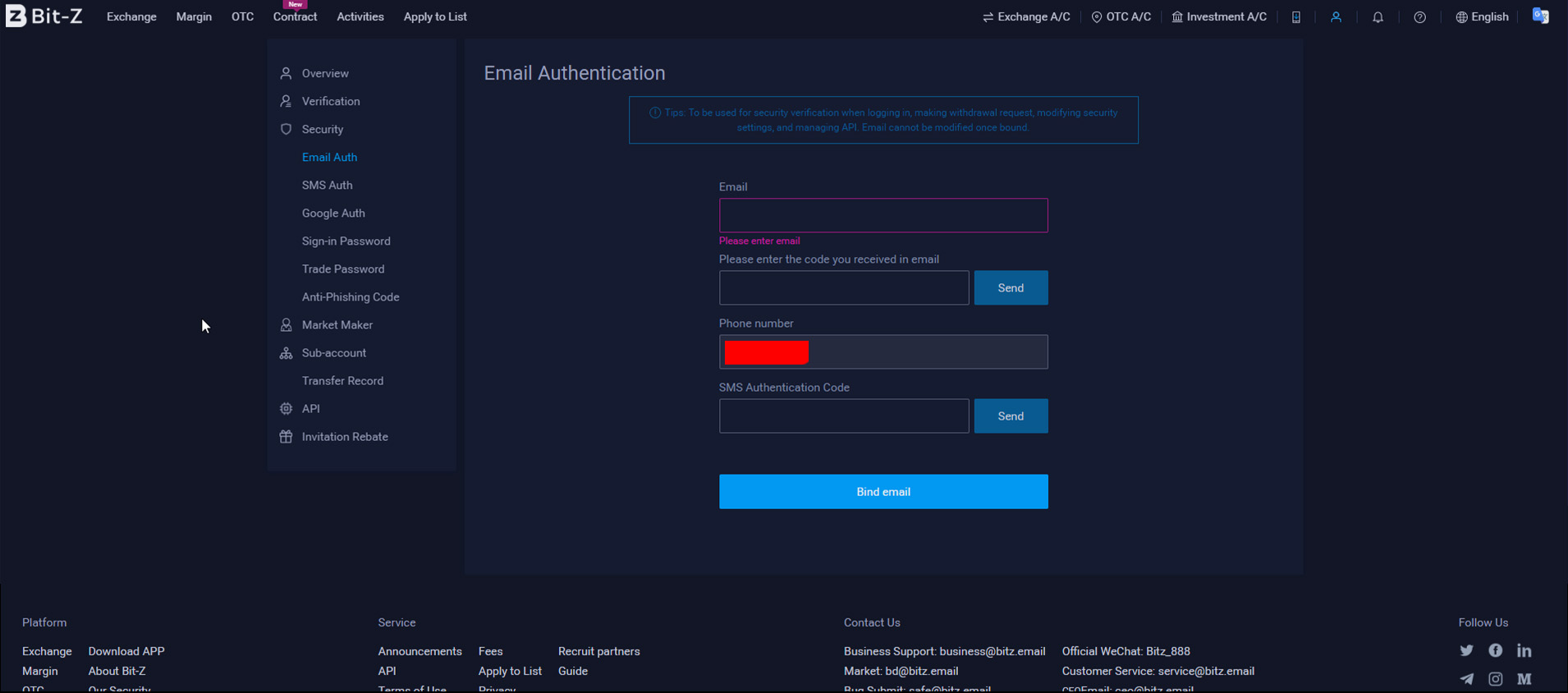 В разделе “Email” жмем кнопку “Bind”, вводим свой адрес почты, нажимаем обе кнопки “Send” и в соответствующие поля водим коды, полученные из почты и из SMS. После чего нажимаем “Bind email”.
