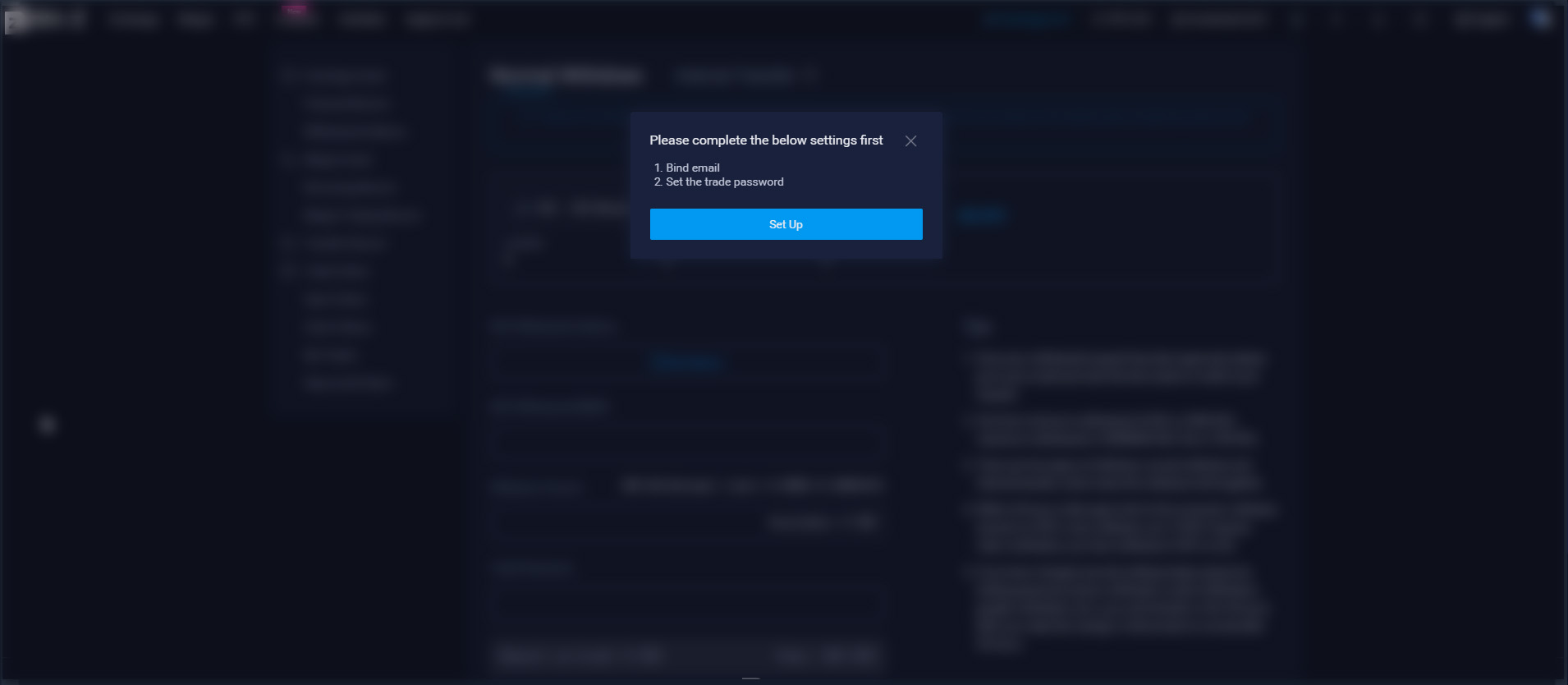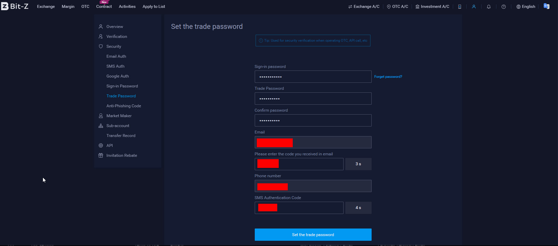 Следующим шагом нам надо создать торговый пароль, который мы будем вводить при сделках на вывод валюты. Выбираем соответствующий пункт в настройках безопасности, вводим свой пароль от входа на биржу, придумываем и повторяем торговый пароль и снова по кнопкам “Send” получаем коды для почты и SMS, чтобы подтвердить, что именно владелец аккаунта меняет торговый пароль. Когда все готово нажимаем “Set the trade password”.