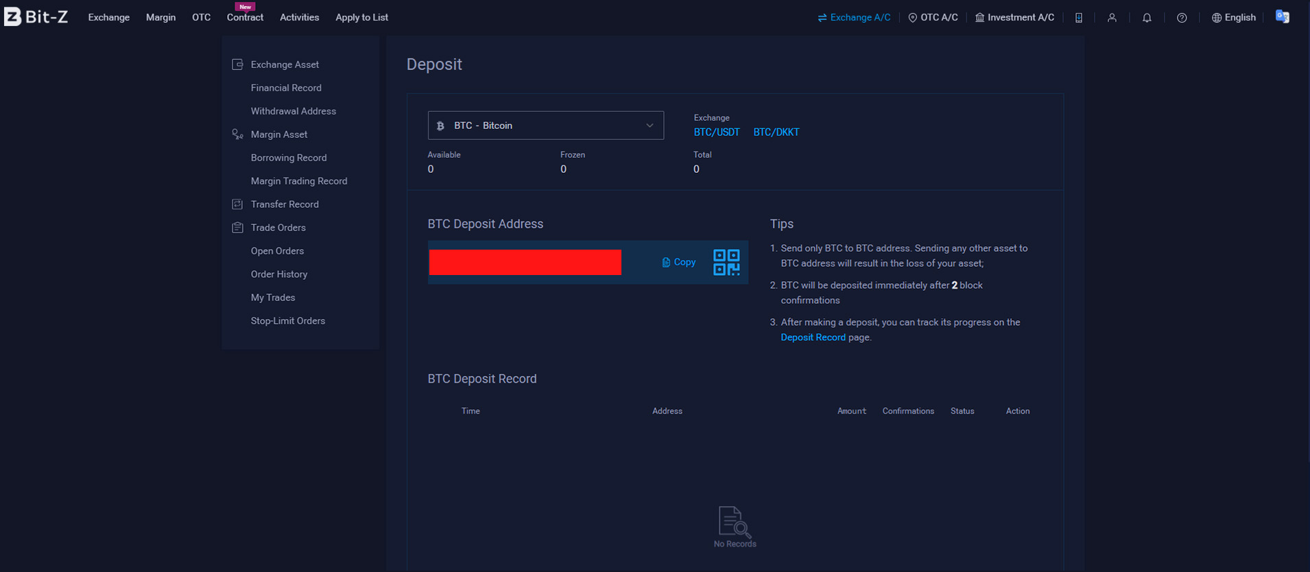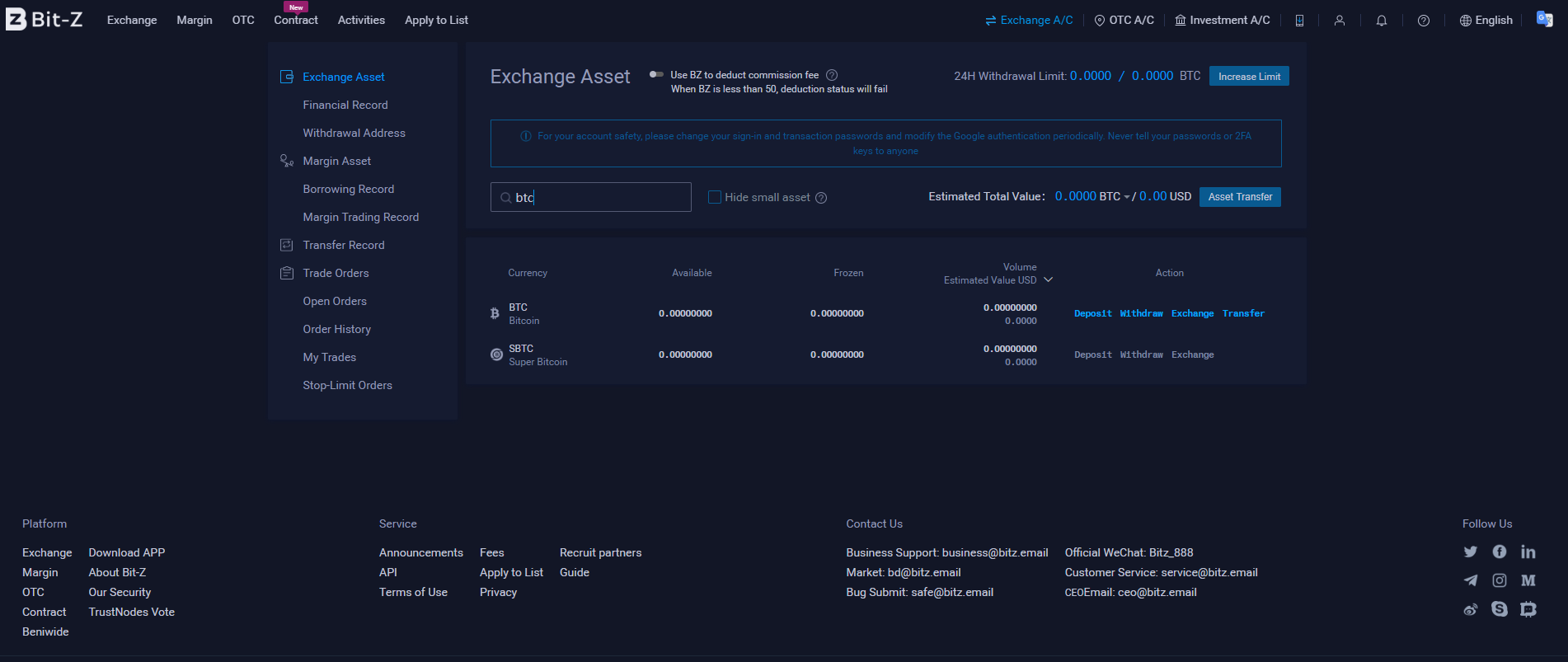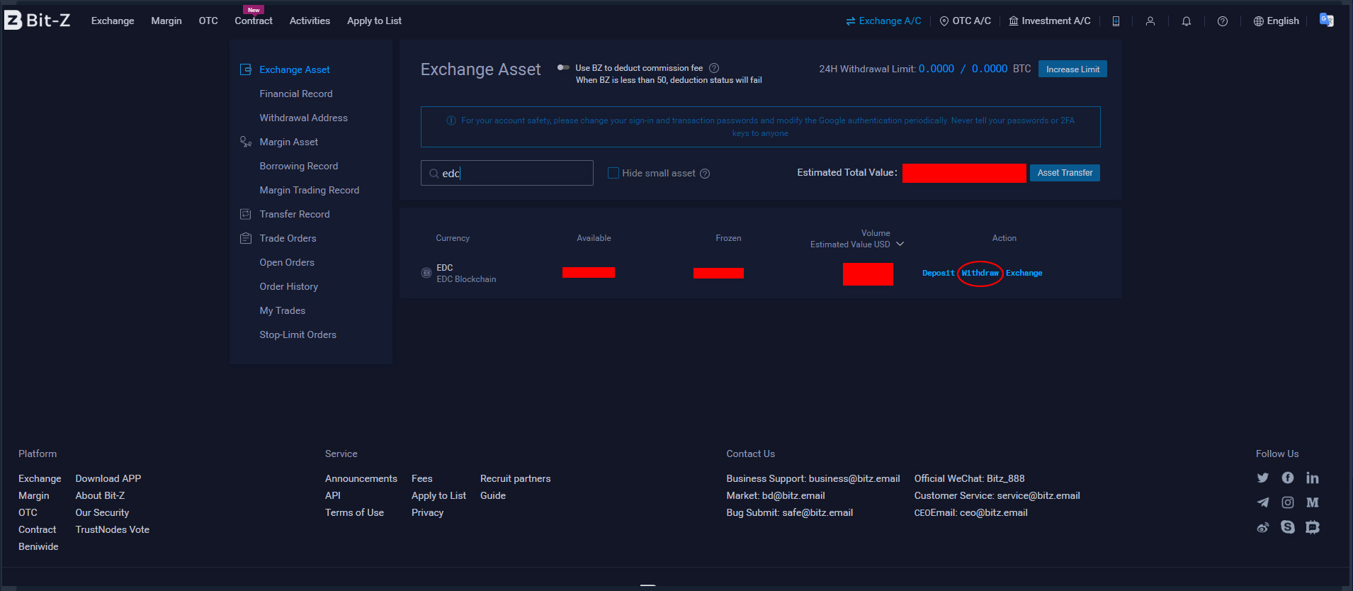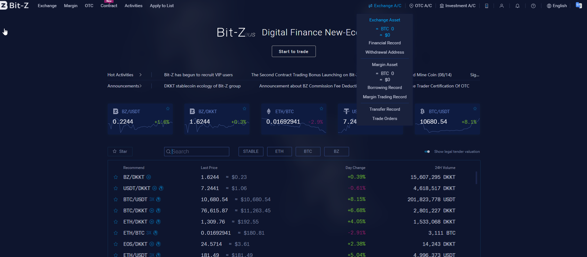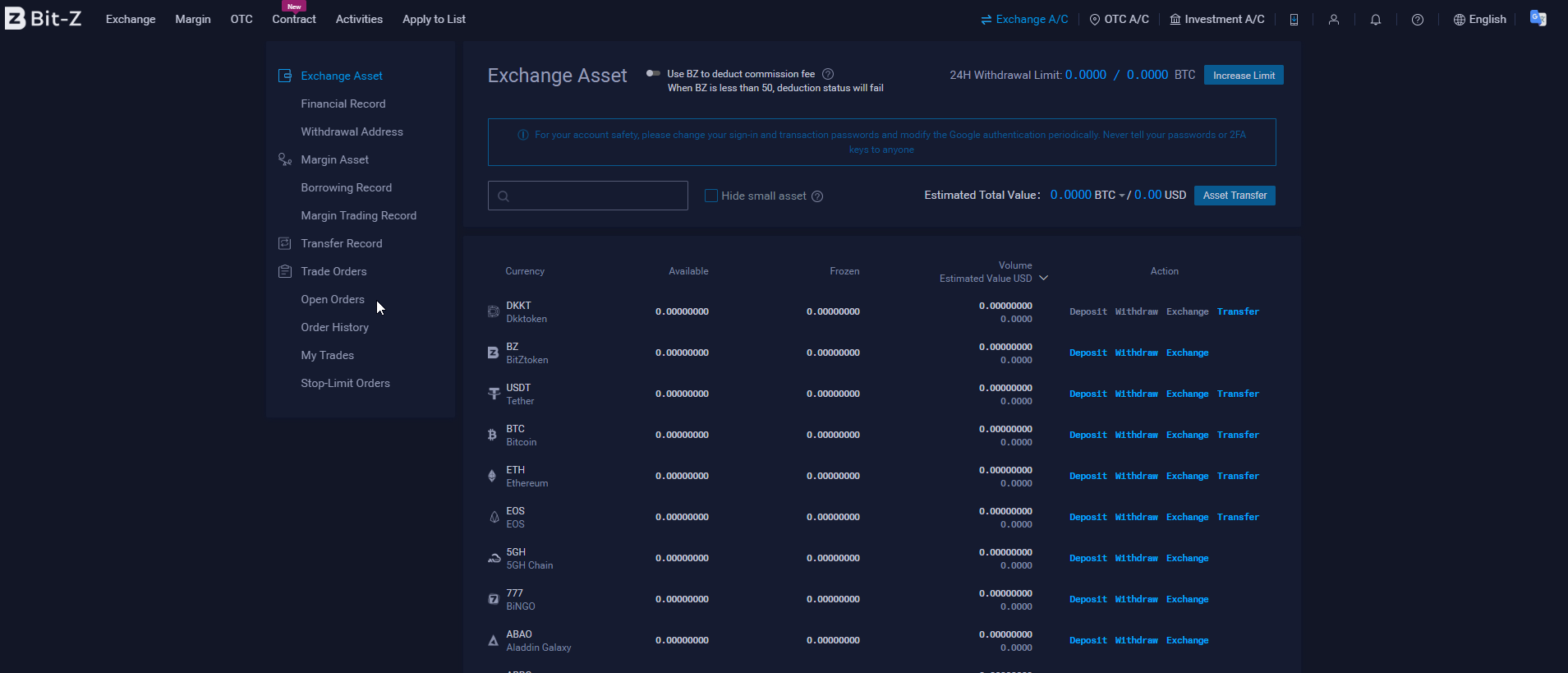 Для того, чтобы пополнить счет аккаунта на бирже Bit-Z, жмем в верхнем правом углу кнопку “Exchange A/C” и в выпадающем меню выбираем пункт “Exchange Asset”.