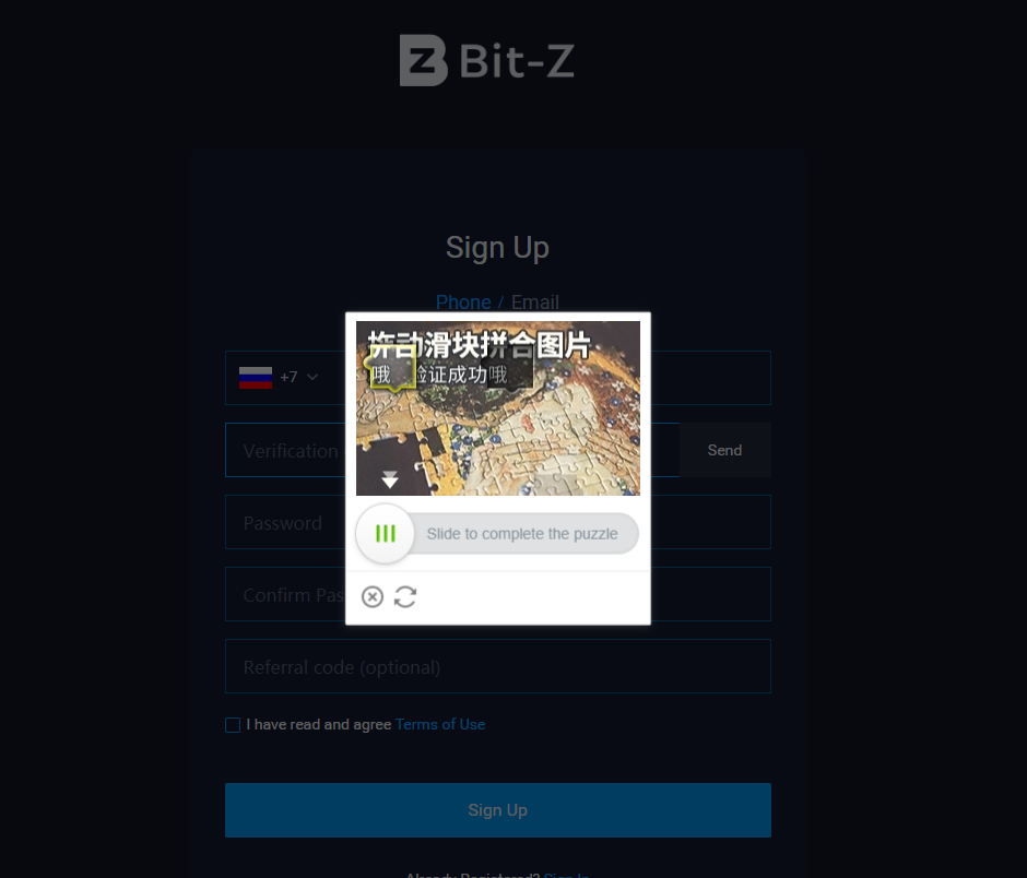 В открывшемся окне вводим номер телефона (не забыв указать верный код своей страны) и нажимаем кнопку “Send”, чтобы сразу получить код подтверждения номера, но перед этим нужно собрать пазл CAPTCHA. После этого вводим код из СМС, придумываем пароль и опционально указываем код реферала.
