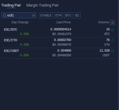 В окне поиска ищем нужную нам монету, в данном случае EDC, и выбираем желаемую торговую пару.